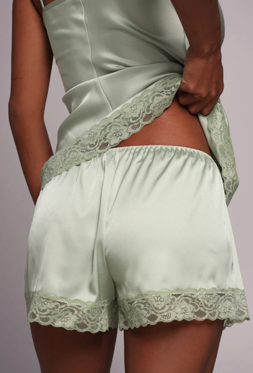 Витончена жіноча піжама Fialka від українського бренду German Volf. Піжама виконана з якісного та м'якого сумішевого шовку ніжного салатового кольору, складається з майки та коротких шортів. Майка напівприлеглого силуету, на тонких бретелях, що регулюються, і з V-подібним декольте, по лінії вирізу та внизу прикрашена мереживом. Шорти з м'якою гумкою в поясі та мереживними вставками внизу. Піжама дуже красива та комфортна, ідеальна для приємного сну та відпочинку, а також може бути відмінним варіантом подарунка близькій чи коханій людині!