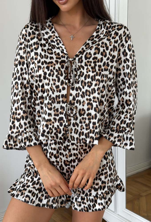 Ефектна жіноча піжама від українського бренду Julia Ulich. Піжама виконана з м'якого та якісного шовк-сатину, кремового кольору в леопардовий принт коричневого з чорним кольору, складається з сорочки та шортів вільного силуету. Сорочка з рукавами 7/8 та відкладним коміром, зав'язується на зав'язки, рукави оброблені рюшами. Шорти з м'якою гумкою в поясі та грайливими рюшами внизу. Піжама дуже красива та комфортна, ідеальна для приємного сну та затишного домашнього відпочинку, також може бути чудовим подарунком коханій та близькій людині!