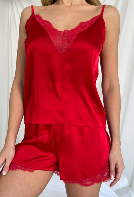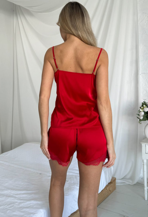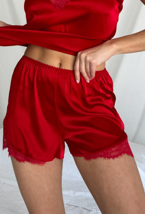 Яскрава жіноча піжама від українського бренду Julia Ulich. Піжама виконана з м'якого та якісного шовк-сатину червоного кольору, складається з майки прямого силуету та коротких шортів. Майка на тонких бретелях, що регулюються, і з глибоким V-подібним декольте, по лінії вирізу модель прикрашена мереживом. Шорти прямого крою та з м'якою гумкою в поясі, внизу та з боків прикрашені вставками з ажурного мережива. Піжама дуже красива і комфортна, підкреслить стиль і додасть впевненості домашньому образу, також може бути чудовим подарунком коханій та близькій людині!