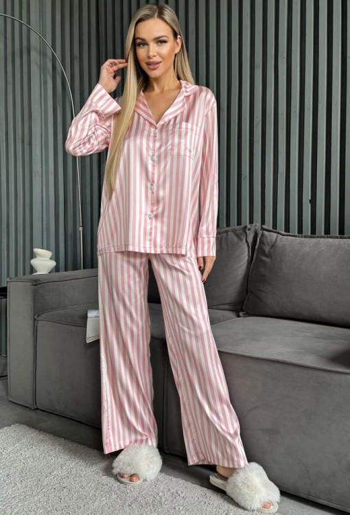 Елегантна жіноча піжама від українського бренду Julia Ulich. Піжама виконана з м'якого та якісного шовк-сатину, рожевого кольору в білий полосатий принт, складається з сорочки та штанів прямого силуету. Сорочка з довгими рукавами та відкладним коміром, застібається на ґудзики, на грудях зліва прикрашена накладною кишенькою, рукави оброблені вільними манжетами. Штани зі зручною посадкою та м'якою гумкою в поясі. Піжама стильна і дуже комфортна, підійде не тільки для сну, але і для затишного домашнього образу, також може бути чудовим подарунком коханій та близькій людині!
