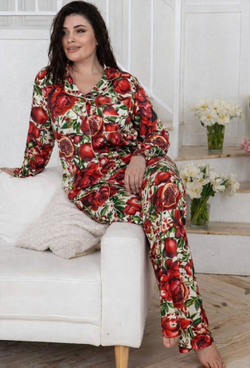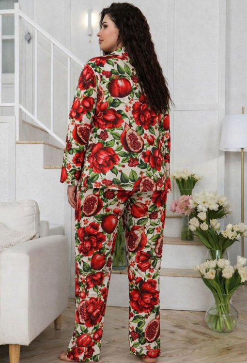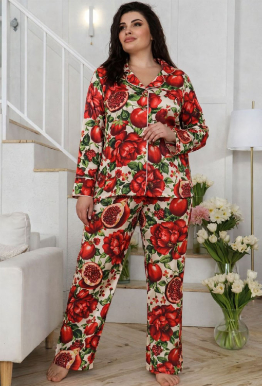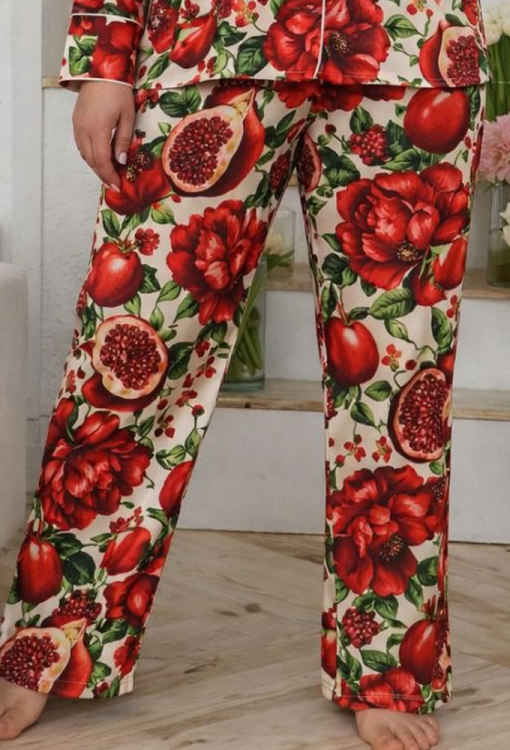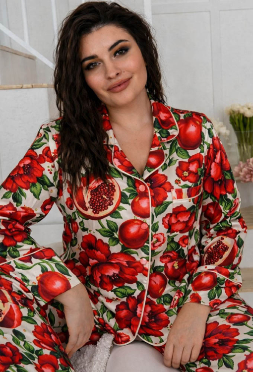 Яскрава жіноча піжама від українського бренду MiaNaGreen. Піжама виконана з м'якого та якісного штучного шовку, кремового кольору в ефектний червоний принт у вигляді плодів та квітів гранату, складається з сорочки та штанів прямого силуету. Сорочка з довгими рукавами, відкладним коміром та накладною кишенею на грудях, застібається на ґудзики. Комір полиці, рукави та кишеню моделі прикрашено тонким кантом кремового кольору. Штани з м'якою гумкою у поясі створюють комфортну посадку та не сковують рухів. Піжама дуже красива та комфортна, ідеальна для сну та домашнього відпочинку, а також може бути чудовим подарунком близькій чи коханій людині.