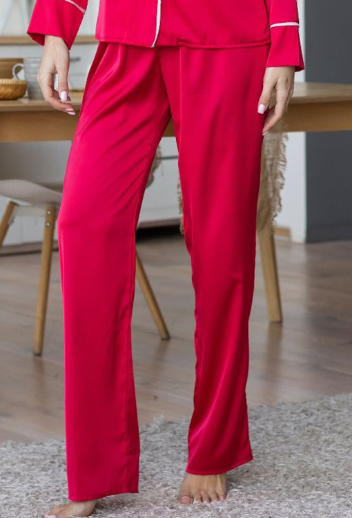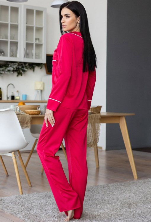 Яскрава жіноча піжама від українського бренду MiaNaGreen. Піжама виконана з м'якого та якісного штучного шовку малинового кольору, складається з сорочки та штанів прямого силуету. Сорочка з довгими рукавами, відкладним коміром та накладною кишенею на грудях, застібається на ґудзики. Комір полиці, рукави та кишеню моделі прикрашено тонким кантом білого кольору. Штани зі зручною посадкою та м'якою гумкою в поясі, регулюються по ширині за допомогою внутрішнього шнурка. Піжама дуже красива та комфортна, ідеальна для сну та домашнього відпочинку, а також може бути чудовим подарунком близькій чи коханій людині.