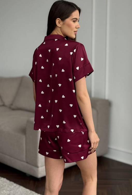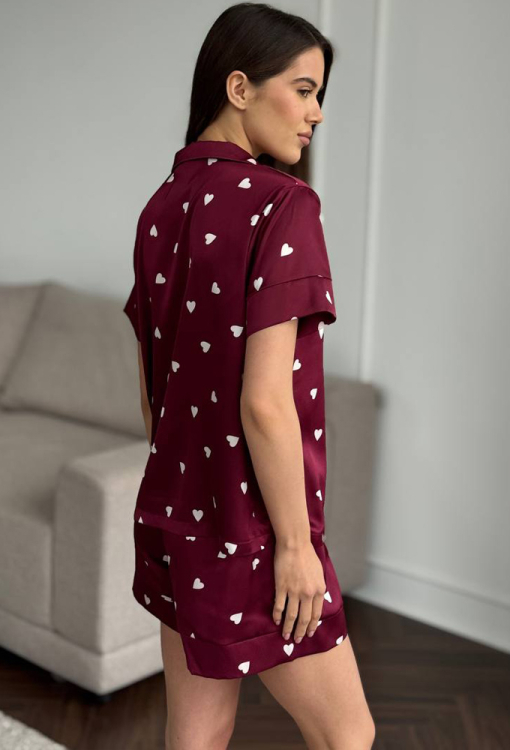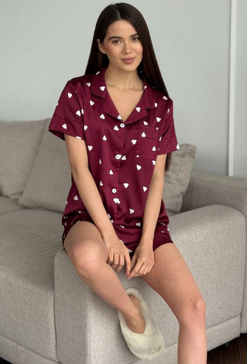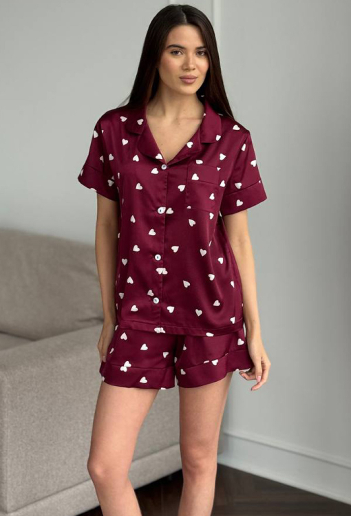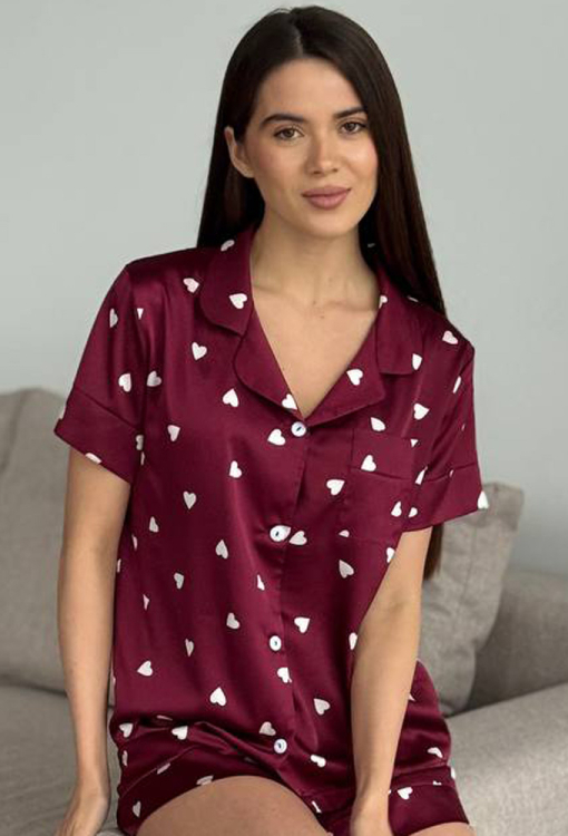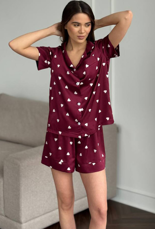 Романтична жіноча піжама від українського бренду V.Velika. Піжама виконана з якісного та м'якого шовку бордового кольору з принтом у вигляді білих сердець, складається з сорочки та шортів вільного силуету. Сорочка з короткими рукавами, відкладним коміром і маленькою нагрудною кишенькою, застібається на ґудзики, рукави оброблені вільними манжетами. Шорти з м'якою гумкою в поясі та вільними манжетами, регулюються по ширині за допомогою внутрішнього шнурка. Піжама неймовірно красива та комфортна, ідеальна як для сну, так і для затишного домашнього відпочинку або подарунка коханій та близькій людині.