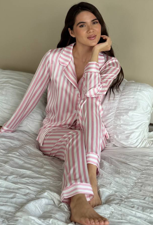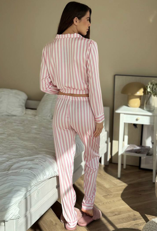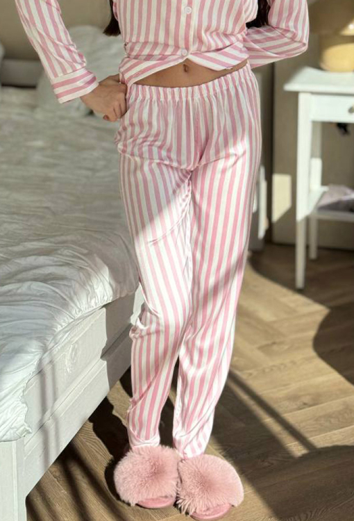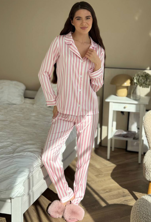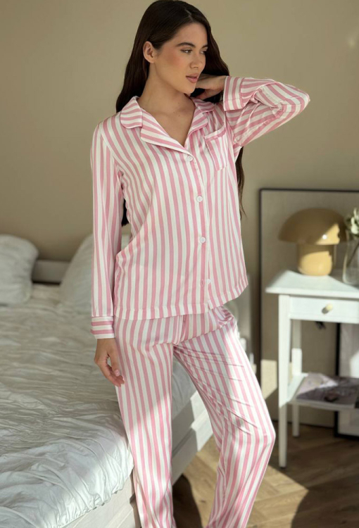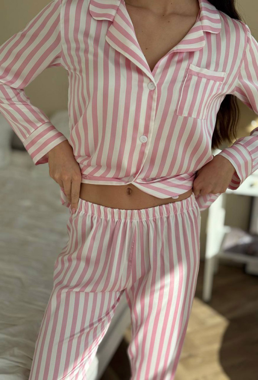 Ніжна жіноча піжама від українського бренду V.Velika. Піжама виконана з якісного та м'якого шовку темно-рожевого кольору з кремовим смугастим принтом, складається з сорочки прямого силуету та злегка звужених штанів. Сорочка з довгими рукавами, відкладним коміром та маленькою нагрудною кишенькою, застібається на ґудзики, рукави оброблені вільними манжетами. Штани із середньою посадкою та м'якою гумкою в поясі, внизу оформлені вільними манжетами. Піжама неймовірно красива та комфортна, ідеальна як для сну, так і для затишного домашнього відпочинку або подарунка коханій та близькій людині.