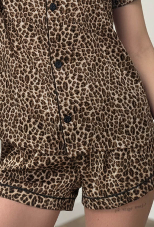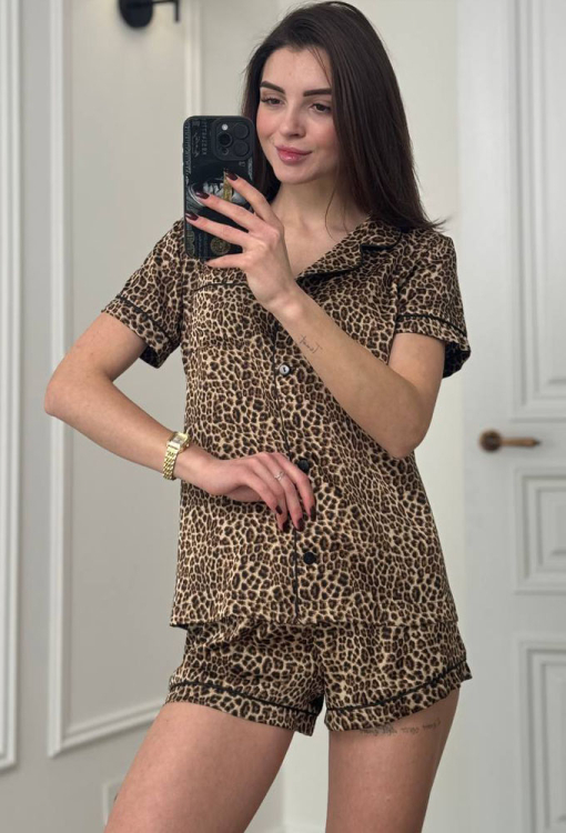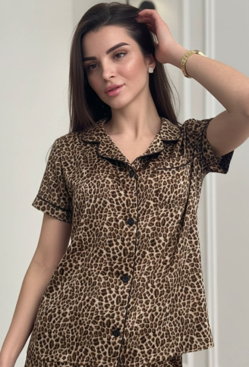 Стильна жіноча піжама від українського бренду V.Velika. Піжама виконана з якісного та м'якого шовку Армані, бежевого кольору з коричневим леопардовим принтом, складається з сорочки прямого силуету та коротких шортів. Сорочка з короткими рукавами, відкладним коміром та маленькою нагрудною кишенькою, застібається на ґудзики. Комір, полиці, рукави та кишеня моделі прикрашені тонким кантом чорного кольору. Шорти зі зручною посадкою та м'якою гумкою у поясі, внизу оформлені контрастним кантом. Піжама неймовірно красива та комфортна, ідеальна як для сну, так і для затишного домашнього відпочинку або подарунка коханій та близькій людині.