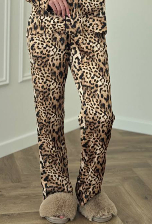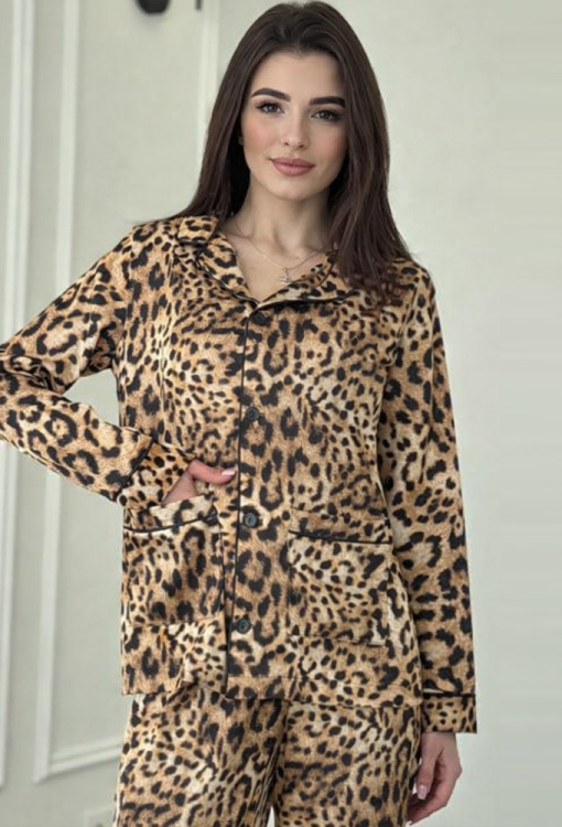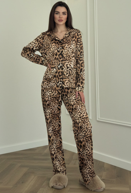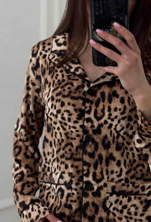 Яскрава жіноча піжама від українського бренду V.Velika. Піжама виконана з якісного та м'якого шовку, бежевого кольору з леопардовим принтом коричневого та чорного кольору, складається з сорочки зі штанами прямого силуету. Сорочка з довгими рукавами, відкладним коміром та двома накладними кишенями, застібається на ґудзики. Комір, полиці, рукави та кишені моделі прикрашені тонким кантом чорного кольору. Штани з високою посадкою та м'якою гумкою у поясі, внизу оформлені контрастним кантом. Піжама неймовірно красива та комфортна, ідеальна як для сну, так і для затишного домашнього відпочинку або подарунка коханій та близькій людині.
