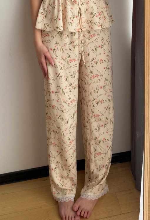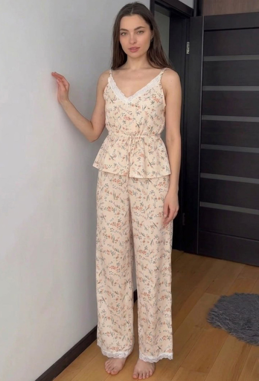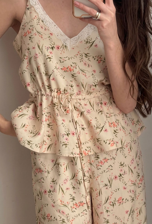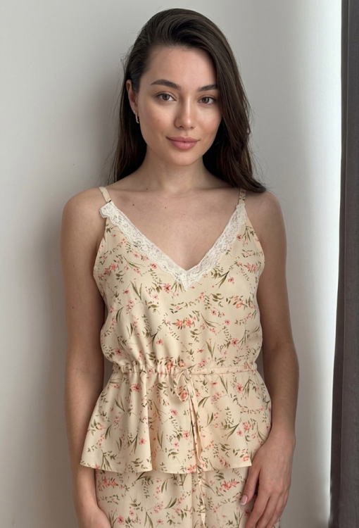 Стильна жіноча піжама від українського бренду DaLi. Піжама виконана з якісного та м'якого штапелю, бежевого кольору в ніжний квітковий принт, складається з майки та штанів. Майка приталеного силуету, на тонких бретелях, що регулюються і з V-подібним декольте, ширина талії регулюється внутрішнім поясом. Штани вільного крою та з м'якою гумкою в поясі. Виріз майки та низ штанів прикрашені тонким мереживом білого кольору. Піжама красива і дуже комфортна, дозволить почуватися впевнено в домашньому оточенні, а також може бути чудовим подарунком коханій та близькій людині.