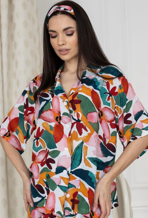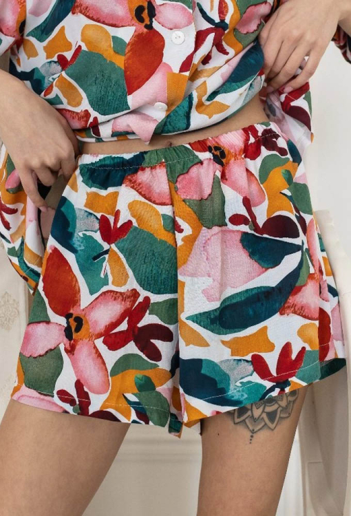 Яскрава жіноча піжама від українського бренду MiaNaGreen. Піжама виконана з м'якого та якісного штапелю, білого кольору у великий квітковий принт червоного, помаранчевого та зеленого кольору, складається з сорочки із шортами вільного силуету в стилі oversize. Сорочка з короткими рукавами, заниженим плечовим швом і відкладним коміром, застібається на ґудзики, спинка оброблена вільною складкою. Шорти зі зручною посадкою та м'якою гумкою в поясі. Піжама дуже красива і комфортна, ідеальна для сну та затишного домашнього відпочинку, а також може бути чудовим подарунком коханій або близькій людині.