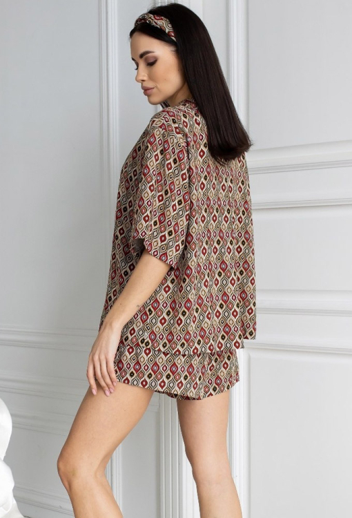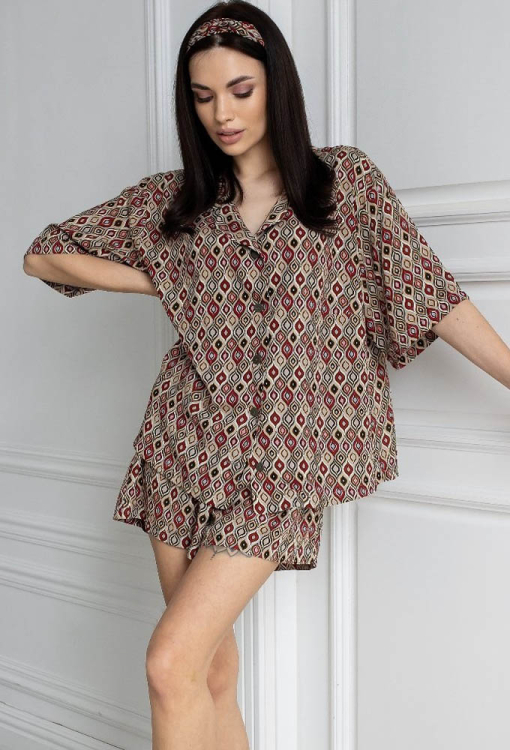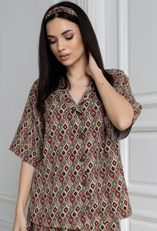 Стильна жіноча піжама від українського бренду MiaNaGreen. Піжама виконана з м'якого та якісного штапелю, коричневого кольору з принтом у вигляді орнамента червоного та чорного кольору, складається з сорочки із шортами вільного силуету в стилі oversize. Сорочка з короткими рукавами, заниженим плечовим швом і відкладним коміром, застібається на ґудзики, спинка оброблена вільною складкою. Шорти зі зручною посадкою та м'якою гумкою в поясі. Піжама дуже красива і комфортна, ідеальна для сну та затишного домашнього відпочинку, а також може бути чудовим подарунком коханій або близькій людині.