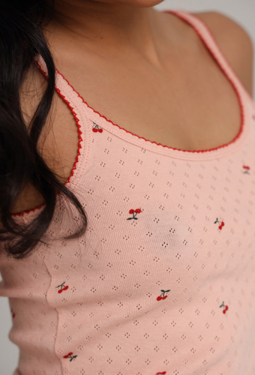 Літня жіноча піжама з колекції MY Cherry від українського бренду German Volf. Піжама виконана з якісного та м'якого трикотажу з ажурною фактурою, пудрового кольору з принтом у вигляді червоних вишень, складається з майки напівприлеглого силуету та прямих шортів. Майка на тонких бретелях та з круглим декольте, по лінії вирізу та внизу проходить хвилястий шов червоного кольору. Шорти з м'якою гумкою в поясі та контрастним оздобленням по низу. Піжама ніжна та комфортна, ідеально підходить для сну та домашнього відпочинку, а також стане чудовим подарунком коханій та близькій людині.