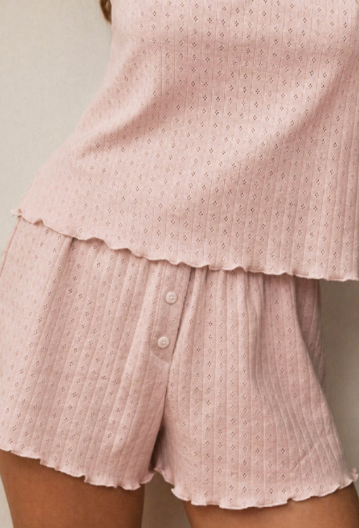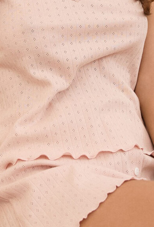 Легка жіноча піжама з колекції Sandra від українського бренду Your Touch. Піжама виконана з м'якого та якісного бавовняного трикотажу з ажурною фактурою рожевого кольору, складається з майки прямого силуету та шортів вільного крою. Майка з тонкими регульованими бретелями та V-подібним декольте, внизу прикрашена хвилястим швом. Шорти зі зручною посадкою та м'якою гумкою в поясі, спереду оброблені трьома ґудзиками, внизу та на поясі – декоративним швом. Піжама дуже красива і комфортна, також може бути зручним одягом для дому, або чудовим подарунком коханій та близькій людині.