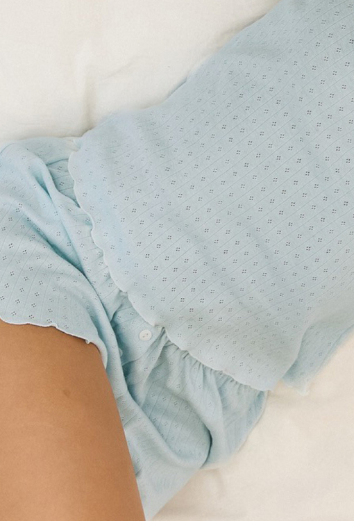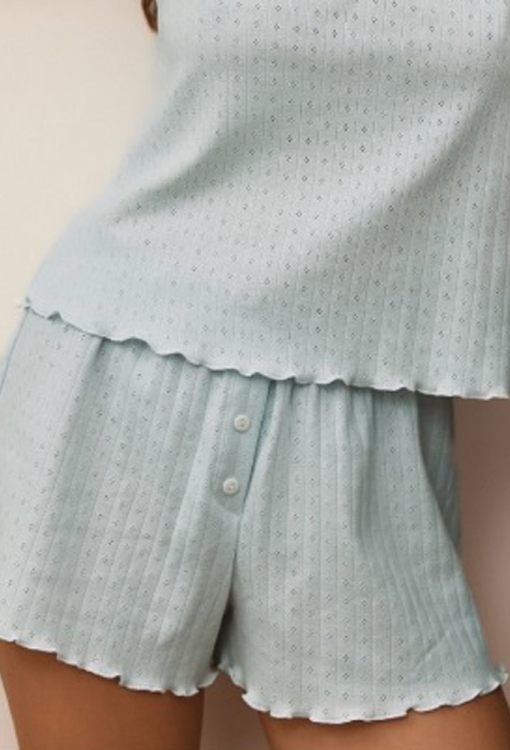 Витончена жіноча піжама з колекції Sandra від українського бренду Your Touch. Піжама виконана з м'якого та якісного бавовняного трикотажу з ажурною фактурою блакитного кольору, складається з майки та шортів вільного силуету. Майка з тонкими регульованими бретелями та V-подібним декольте, внизу прикрашена хвилястим швом. Шорти зі зручною посадкою та м'якою гумкою у поясі, спереду оброблені трьома ґудзиками, внизу – декоративним швом. Піжама дуже красива і комфортна, також може бути зручним одягом для дому, або чудовим подарунком коханій та близькій людині.