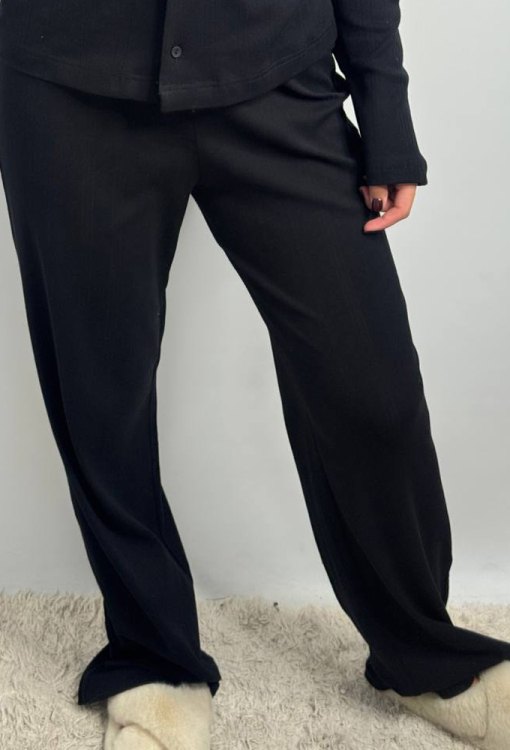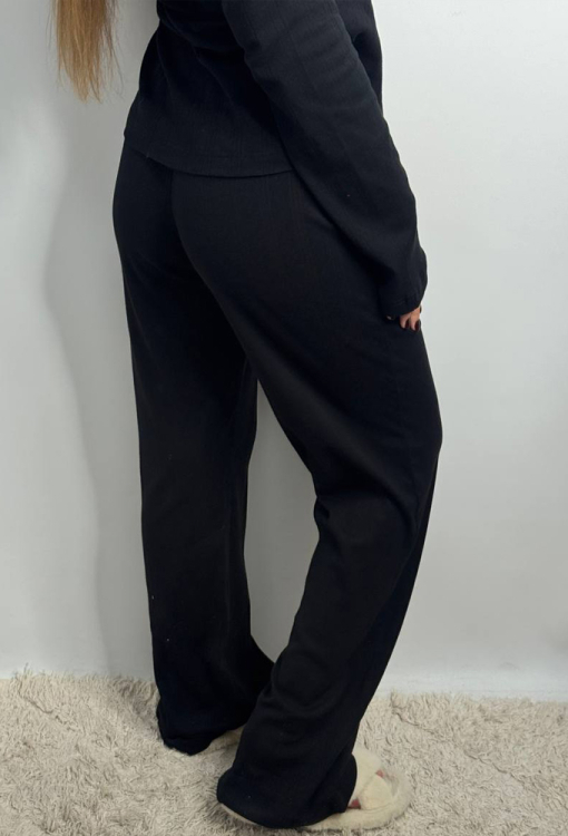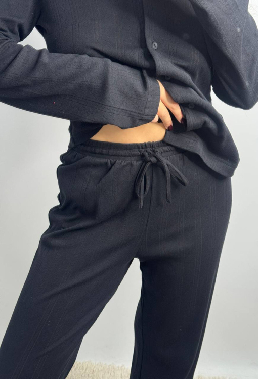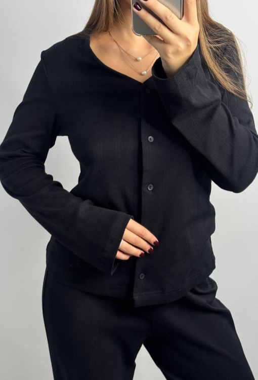 Ніжна жіноча піжама від українського бренду V.Velika. Піжама виконана з якісного та м'якого трикотажу з красивою візерунчастою фактурою чорного кольору, складається з кофти та штанів вільного силуету. Кофта з довгими рукавами та V-подібним вирізом горла, застібається на гудзики. Штани з високою посадкою та м'якою гумкою в поясі регулюються по ширині за допомогою внутрішнього шнурка. Піжама неймовірно красива та комфортна, ідеальна як для сну, так і для затишного домашнього відпочинку або подарунка коханій та близькій людині.