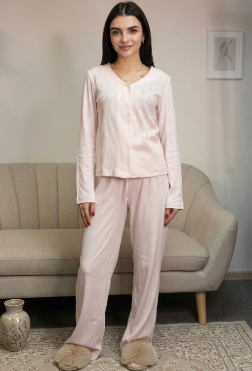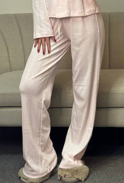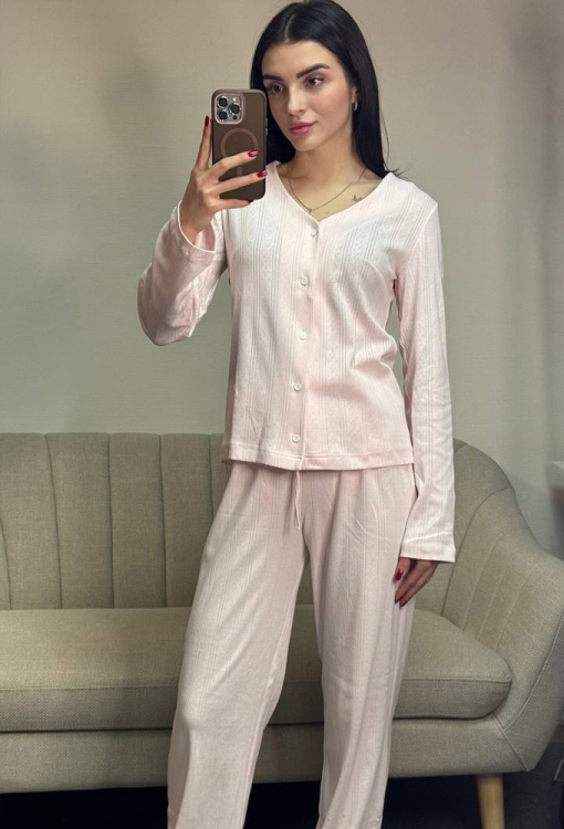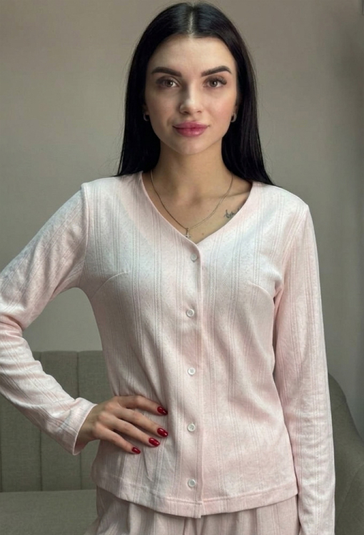 Ніжна жіноча піжама від українського бренду V.Velika. Піжама виконана з якісного та м'якого трикотажу з ажурною фактурою у вигляді смужок та ромбів рожевого кольору, складається з кофти та штанів вільного силуету. Кофта з довгими рукавами та V-подібним вирізом горла, застібається на гудзики. Штани з високою посадкою та м'якою гумкою в поясі регулюються по ширині за допомогою внутрішнього шнурка. Піжама неймовірно красива та комфортна, ідеальна як для сну, так і для затишного домашнього відпочинку або подарунка коханій та близькій людині.