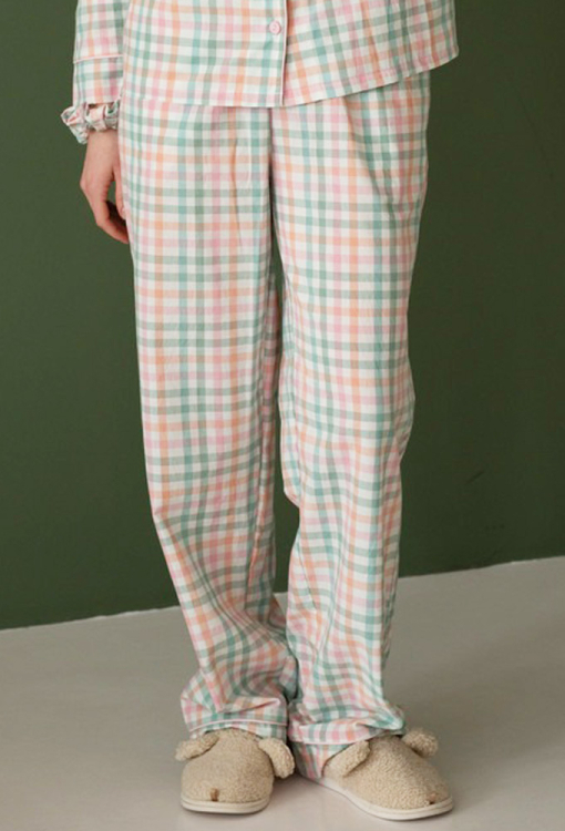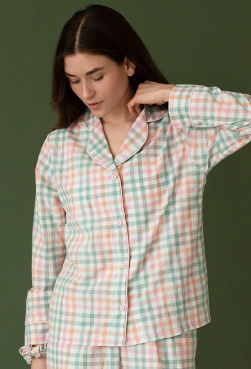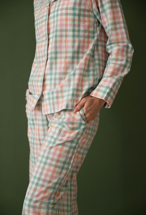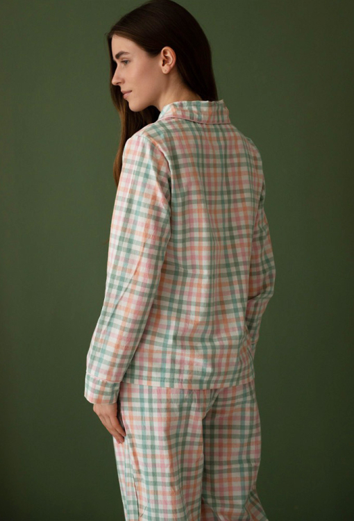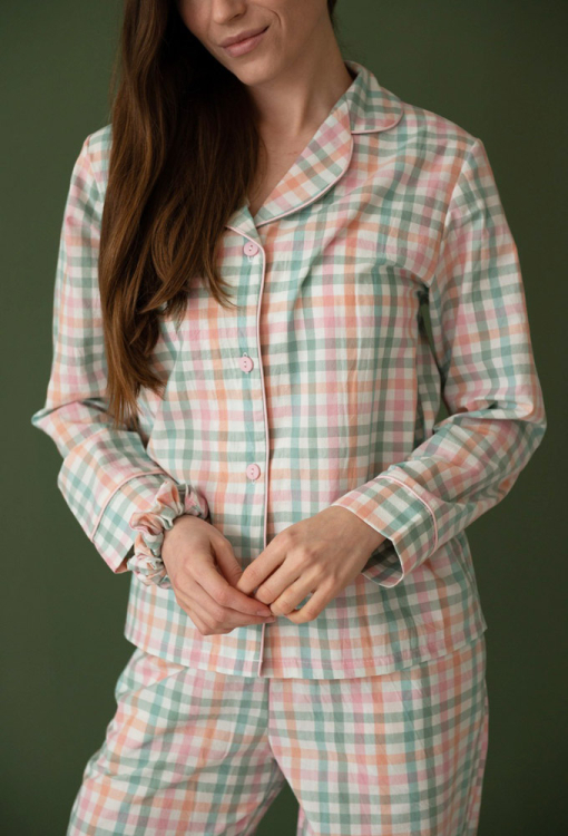 Комфортна жіноча піжама від українського бренду LoomLine. Піжама виконана з якісної та м'якої вареної бавовни, з кольоровим картатим принтом, складається з сорочки прямого силуету та вільних штанів. Сорочка з довгими рукавами та відкладним коміром, застібається на ґудзики. Комір, полиці та рукави моделі прикрашені тонким кантом рожевого кольору. Штани з м'якою гумкою в поясі та зручними бічними кишенями, внизу оброблені вільними манжетами з рожевим кантом. Піжама красива і дуже зручна, ідеальна для сну та домашнього затишку, а також може бути чудовим подарунком коханій та близькій людині.