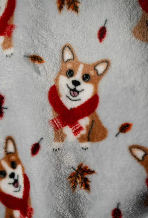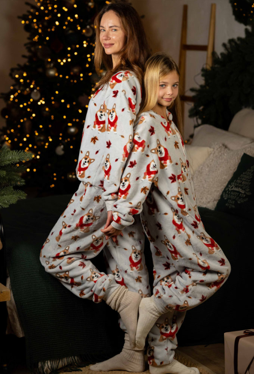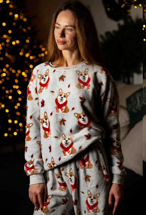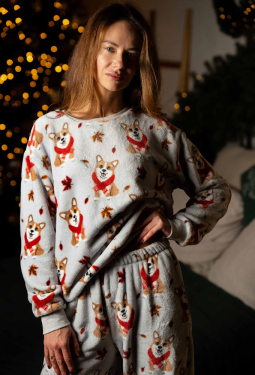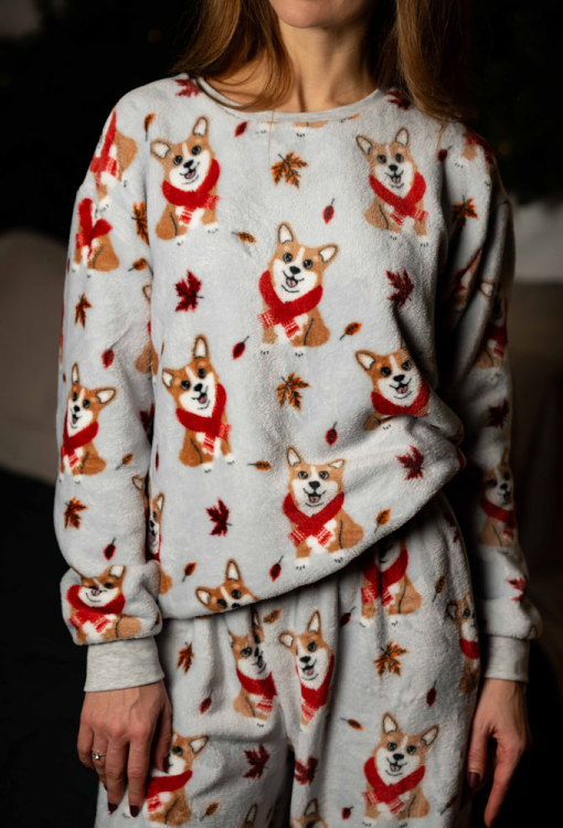 Яскрава жіноча новорічна піжама від українського бренду German Volf. Піжама виконана з якісного та м'якого велсофту, сірого кольору з принтом у вигляді коричневих собачок у червоних шарфиках та осіннього листя, складається з кофти та штанів вільного силуету. Кофта з довгими рукавами та круглим вирізом, рукави, низ та горловина моделі оброблені однотонними манжетами сірого кольору. Штани з м'якою гумкою в поясі та трикотажними манжетами внизу. Піжама затишна та дуже красива, створить затишну атмосферу для відпочинку вдома, також стане чудовим подарунком близьким людям.