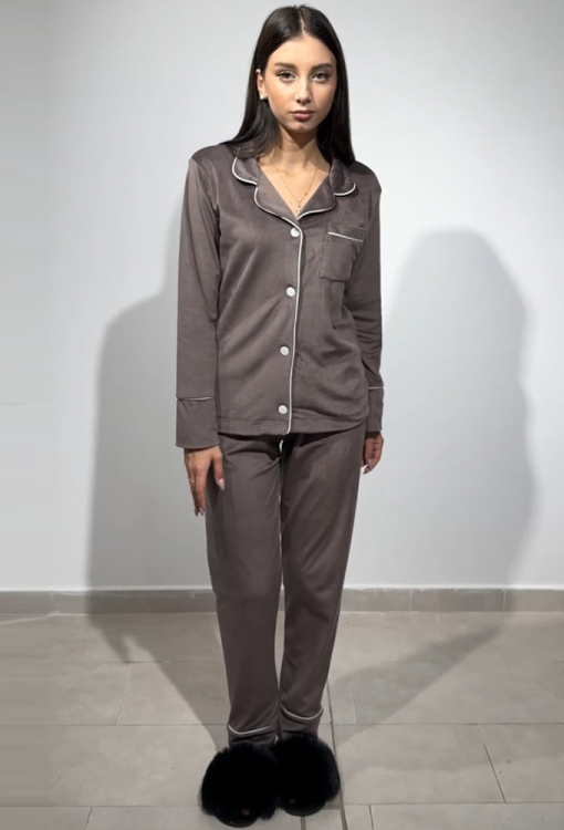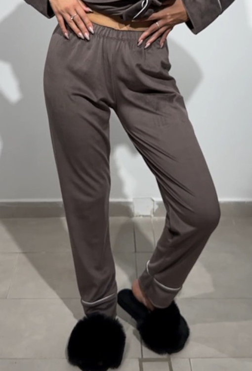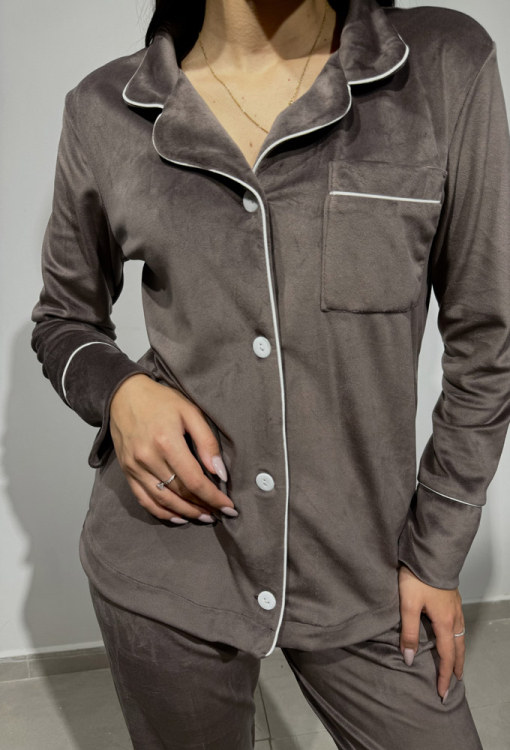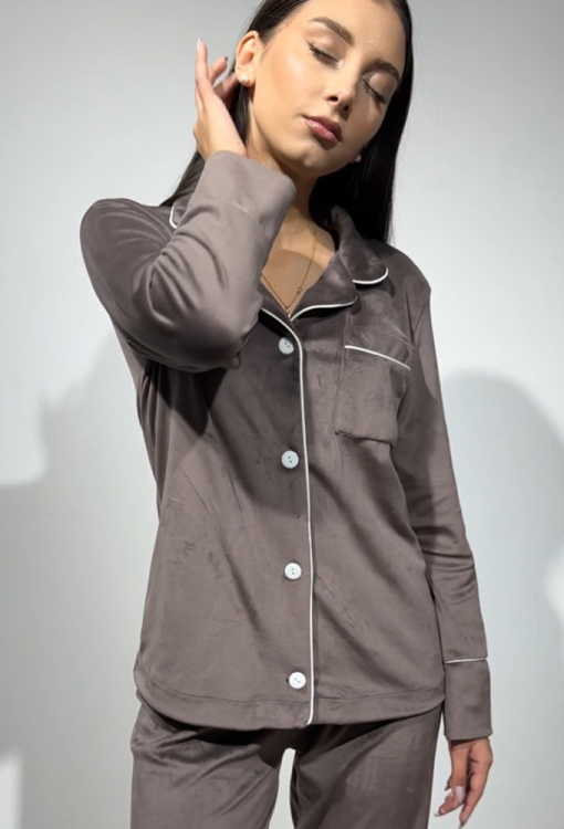 Ніжна та приємна до тіла жіноча піжама від українського бренду BO.Brand. Піжама виконана з якісного та м'якого велюру шоколадного кольору, складається з сорочки прямого силуету та звужених штанів. Сорочка з довгими рукавами та відкладним коміром, застібається на ґудзики, на грудях зліва прикрашена маленькою накладною кишенькою. Комір, полиці, рукави та кишеня моделі прикрашені тонким кантом білого кольору. Штани зі зручною посадкою та м'якою гумкою у поясі, внизу також прикрашені білим кантом. Піжама красива і дуже комфортна, ідеальна для холодних ночей та вечорів, а також може бути чудовим подарунком коханій та близькій людині.