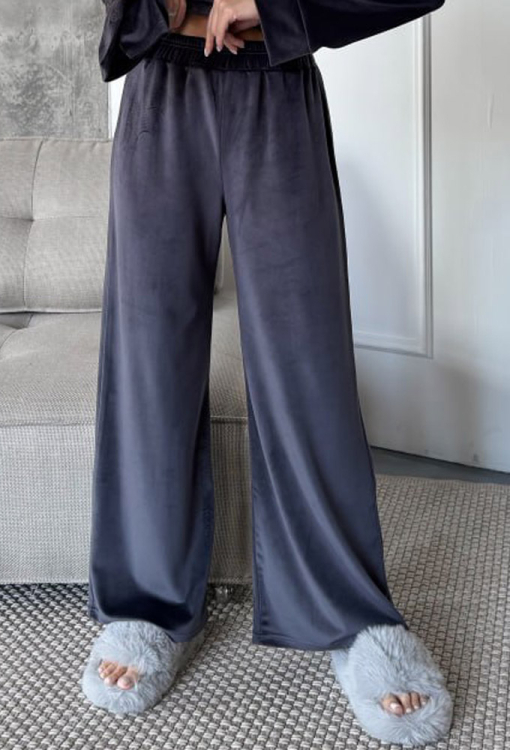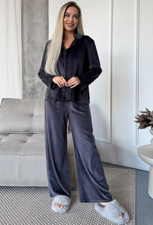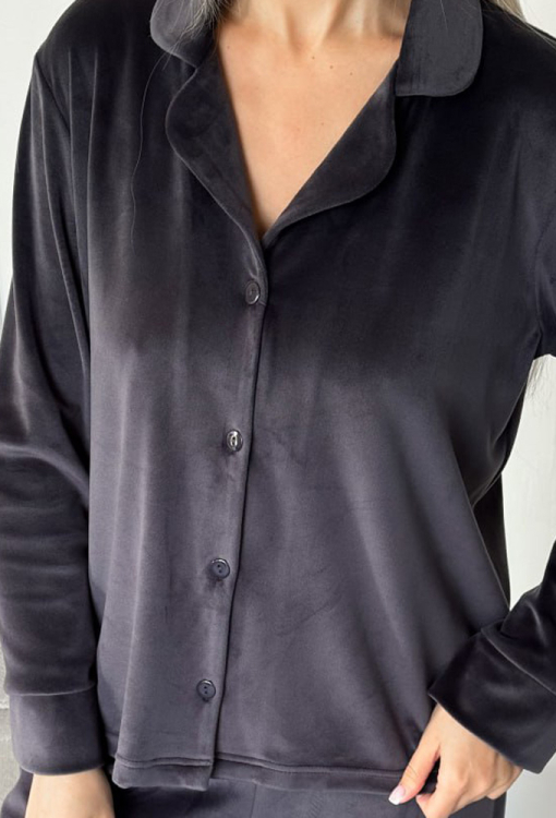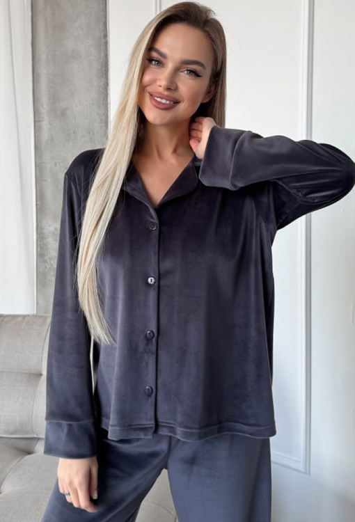 Тепла жіноча зимова піжама Ніколь від українського бренду Julia Ulich. Піжама виконана з м'якого та якісного велюру графітового кольору, складається з сорочки та штанів вільного силуету. Сорочка з довгими рукавами та відкладним коміром, застібається на ґудзики, рукави оброблені вільними манжетами. Штани зі зручною посадкою та м'якою гумкою в поясі. Піжама дуже красива і комфортна, підкреслить стиль і додасть впевненості домашньому образу, також може бути чудовим подарунком коханій та близькій людині!