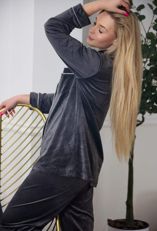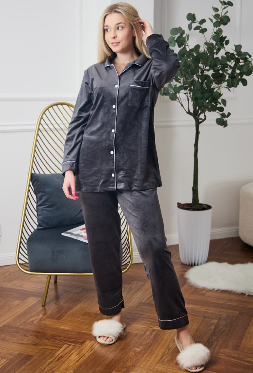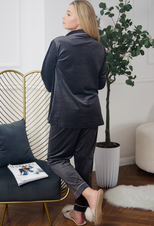Елегантна жіноча піжама від українського бренду Tomiko. Піжама виконана з м'якого та якісного велюру графітового кольору, складається з сорочки та штанів прямого силуету. Сорочка з довгими рукавами та відкладним коміром, застібається на ґудзики. На грудях зліва модель прикрашена накладною кишенькою, комір, полиці, рукави та кишеня оброблені тонким кантом білого кольору. Штани зі зручною посадкою та м'якою гумкою у поясі, внизу прикрашені тонким білим кантом. Піжама дуже красива і комфортна, ідеальна для сну та домашнього відпочинку в холодні дні, а також може бути чудовим подарунком коханій або близькій людині.