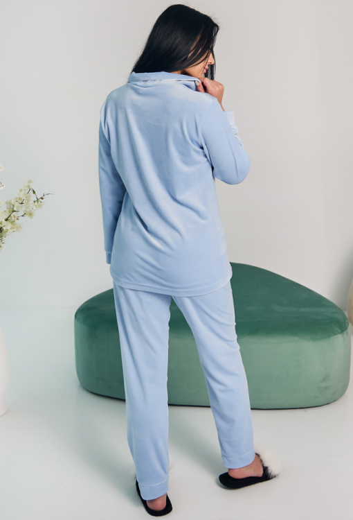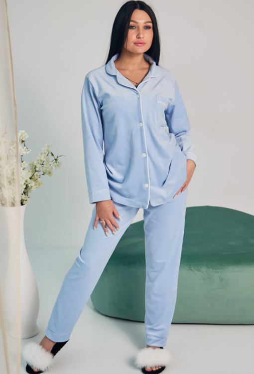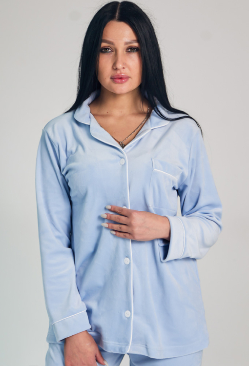 Красива жіноча піжама від українського бренду Tomiko. Піжама виконана з м'якого та якісного велюру блакитного кольору, складається з сорочки та штанів прямого силуету. Сорочка з довгими рукавами та відкладним коміром, застібається на ґудзики. На грудях зліва модель прикрашена накладною кишенькою, комір, полиці, рукави та кишеня оброблені шовковим кантом білого кольору. Штани зі зручною посадкою та м'якою гумкою у поясі, внизу прикрашені тонким білим кантом. Піжама стильна і дуже комфортна, ідеальна для сну та домашнього відпочинку в холодні дні, а також може бути чудовим подарунком коханій або близькій людині.