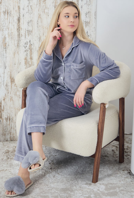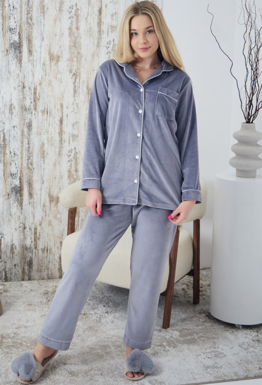 Тепла та комфортна жіноча зимова піжама від українського бренду Tomiko. Піжама виконана з м'якого та якісного велюру сірого кольору, складається з сорочки та штанів прямого силуету. Сорочка з довгими рукавами та відкладним коміром, застібається на ґудзики. На грудях зліва модель прикрашена накладною кишенькою, комір, полиці, рукави та кишеня оброблені шовковим кантом білого кольору. Штани зі зручною посадкою та м'якою гумкою у поясі, внизу прикрашені тонким білим кантом. Піжама дуже красива та зручна, ідеальна для сну та домашнього відпочинку в холодні дні, а також може бути чудовим подарунком коханій або близькій людині.