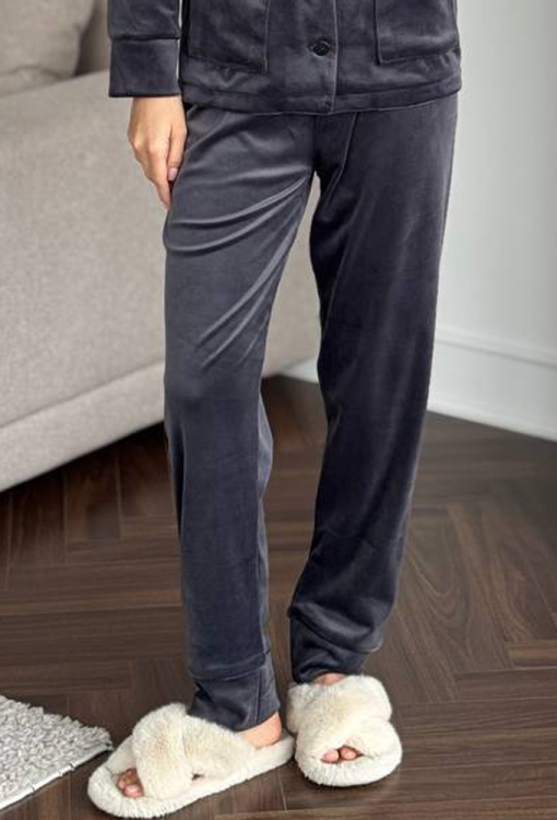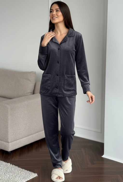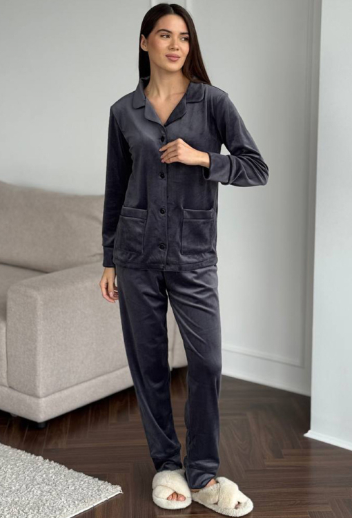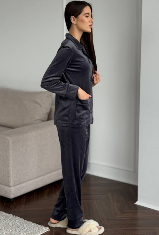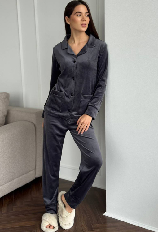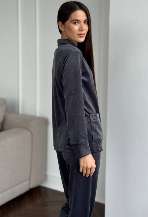 Жіноча зимова піжама від українського бренду V.Velika - гармонійне поєднання елегантності, комфорту та затишку. Піжама виконана з якісного та м'якого велюру кольору світлий графіт, складається з сорочки прямого силуету та злегка звужених штанів, створюючи стильний домашній образ. Сорочка з довгими рукавами, відкладним коміром та двома накладними кишенями застібається на ґудзики, рукави оброблені вільними манжетами. Комір, полиці, рукави та кишені моделі прикрашені тонким кантом чорного кольору. Штани зі зручною посадкою та м'якою гумкою в поясі не сковують рухів, вільні манжети внизу дарують максимальну зручність, тонкий чорний кант по лінії манжет створює завершений образ. Піжама неймовірно красива та комфортна, ідеальна як для сну, так і для затишного домашнього відпочинку або подарунка коханій та близькій людині.