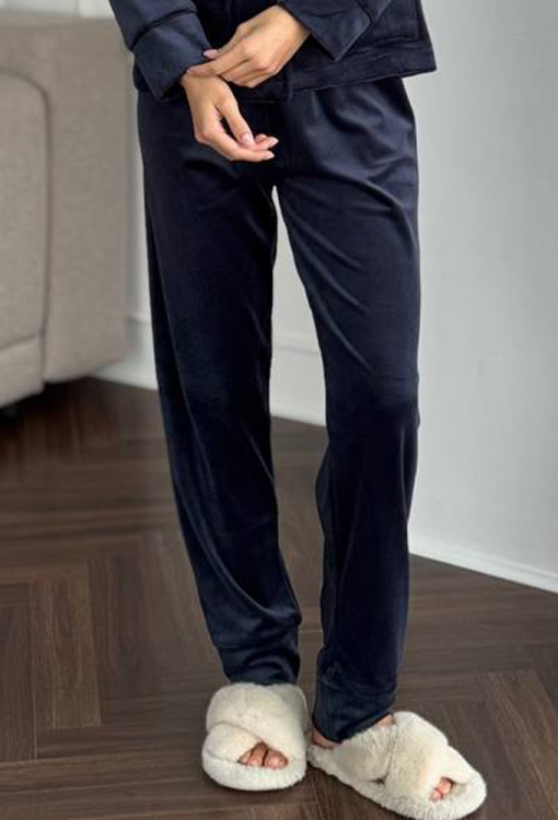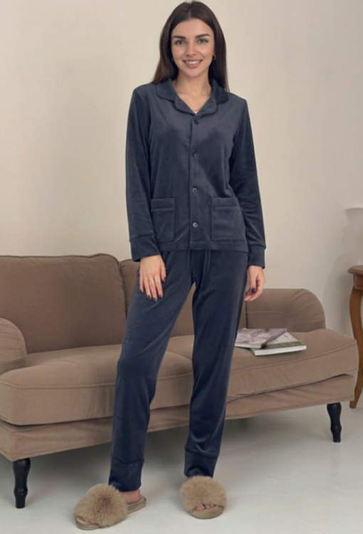 Жіноча зимова піжама від українського бренду V.Velika - гармонійне поєднання елегантності, комфорту та затишку. Піжама виконана з якісного та м'якого велюру графітового кольору, складається з сорочки прямого силуету та злегка звужених штанів, створюючи стильний домашній образ. Сорочка з довгими рукавами, відкладним коміром та двома накладними кишенями застібається на ґудзики, рукави оброблені вільними манжетами. Комір, полиці, рукави та кишені моделі прикрашені тонким кантом чорного кольору. Штани зі зручною посадкою та м'якою гумкою в поясі не сковують рухів, вільні манжети внизу дарують максимальну зручність, тонкий чорний кант по лінії манжет створює завершений образ. Піжама неймовірно красива та комфортна, ідеальна як для сну, так і для затишного домашнього відпочинку або подарунка коханій та близькій людині.