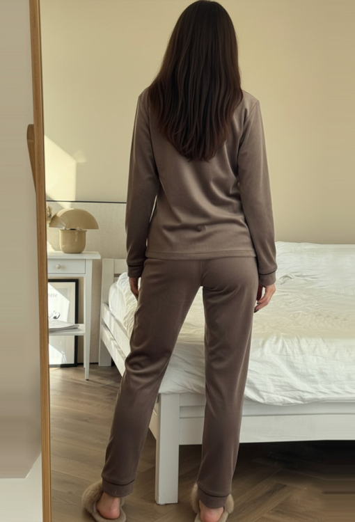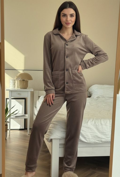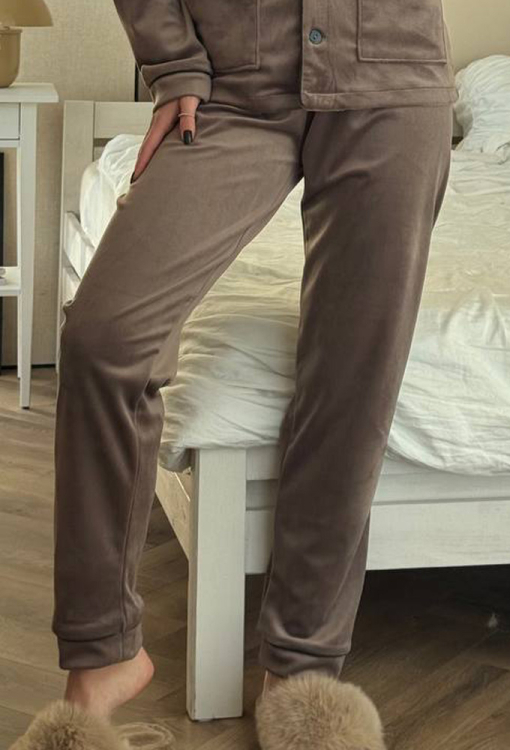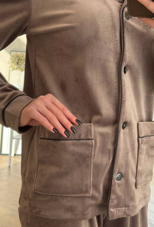 Жіноча зимова піжама від українського бренду V.Velika - гармонійне поєднання елегантності, комфорту та затишку. Піжама виконана з якісного та м'якого велюру кольору мокко, складається з сорочки прямого силуету та злегка звужених штанів, створюючи стильний домашній образ. Сорочка з довгими рукавами, відкладним коміром та двома накладними кишенями застібається на ґудзики, рукави оброблені вільними манжетами. Комір, полиці, рукави та кишені моделі прикрашені тонким кантом чорного кольору. Штани зі зручною посадкою та м'якою гумкою в поясі не сковують рухів, вільні манжети внизу дарують максимальну зручність, тонкий чорний кант по лінії манжет створює завершений образ. Піжама неймовірно красива та комфортна, ідеальна як для сну, так і для затишного домашнього відпочинку або подарунка коханій та близькій людині.
