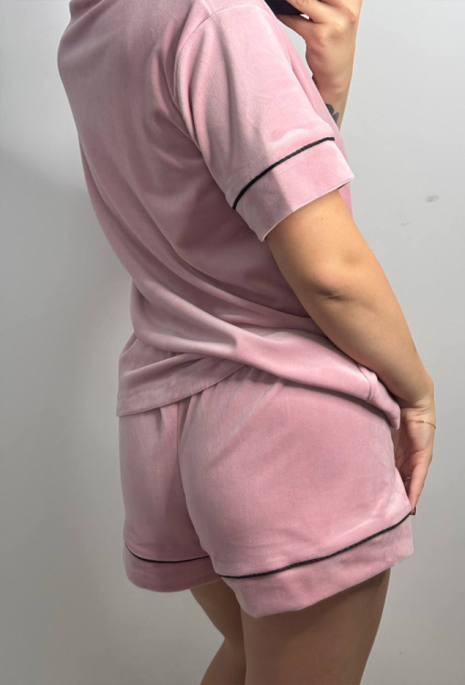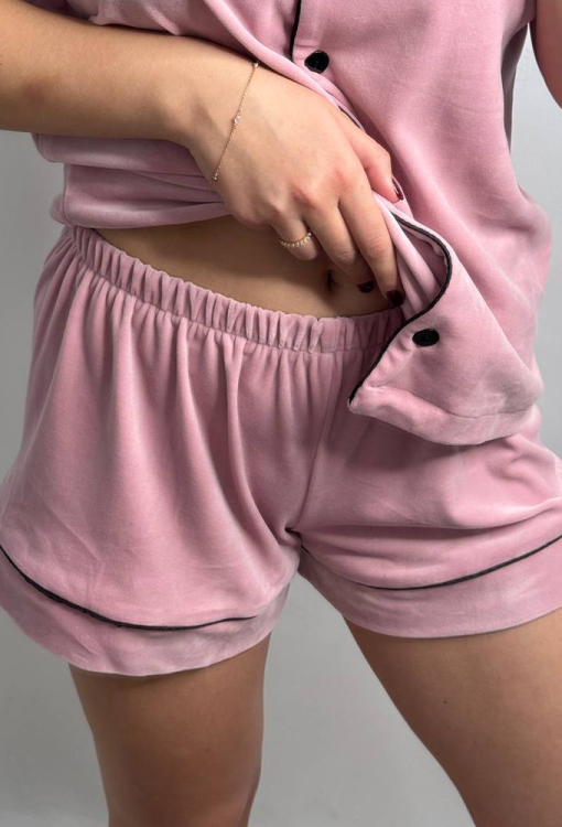 Ніжна жіноча піжама від українського бренду V.Velika - вишукане поєднання затишку, жіночності та стильного домашнього образу. Піжама виконана з якісного та м'якого велюру пудрового кольору, який дарує комфорт та відчуття тепла. Комплект складається з сорочки прямого силуету та коротких шортів, створюючи елегантний та сучасний образ для дому. Сорочка з короткими рукавами та відкладним коміром застібається на ґудзики, забезпечуючи зручну посадку та свободу рухів. Комір, полички та рукави акуратно оформлені тонким чорним кантом, який додає моделі контрастний акцент. Шорти вільного крою з м'якою гумкою в поясі та манжетами, прикрашені тонким чорним кантом по лінії манжет, що підкреслює продуманий дизайн. Піжама неймовірно красива та комфортна, ідеально підходить для сну та затишного домашнього відпочинку, а також стане чудовим подарунком для коханої та близької людини.