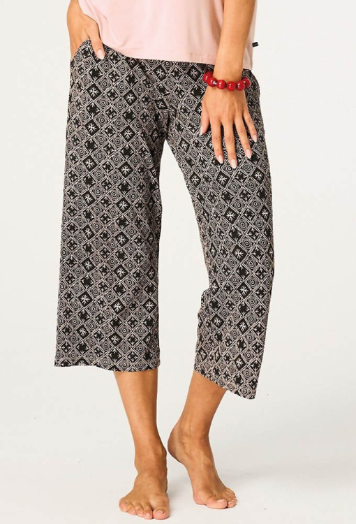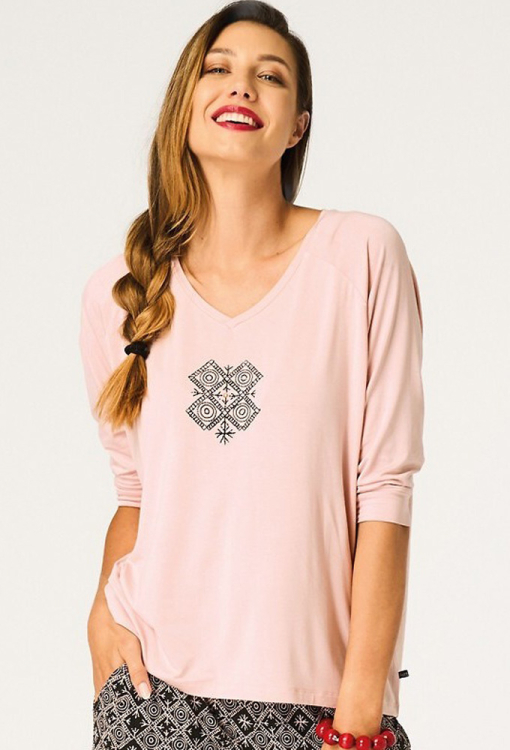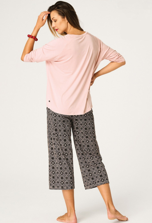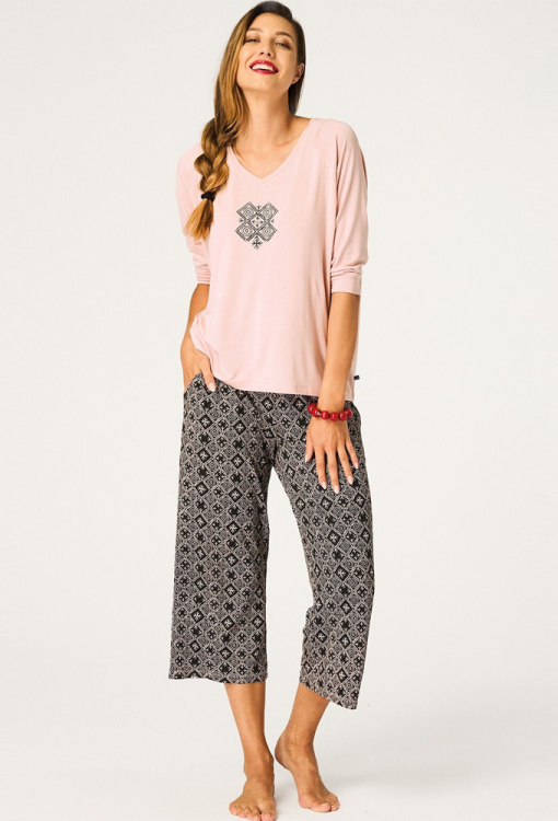 Стильна жіноча піжама від польського бренду Key. Піжама виконана з якісної та м'якої віскози, складається з кофти світло-рожевого кольору та чорних капрі з принтом у вигляді рожевого орнаменту. Кофта вільного силуету з рукавами 3/4 і V-подібним вирізом горла, по центру прикрашена ніжним принтом в тон капрі з бусинкою, що переливається. Капрі також вільного крою з м'якою гумкою в поясі та зручними бічними кишенями. Піжама красива і дуже комфортна, ідеально для сну та домашнього відпочинку, також може бути корисним подарунком коханій та близькій людині.