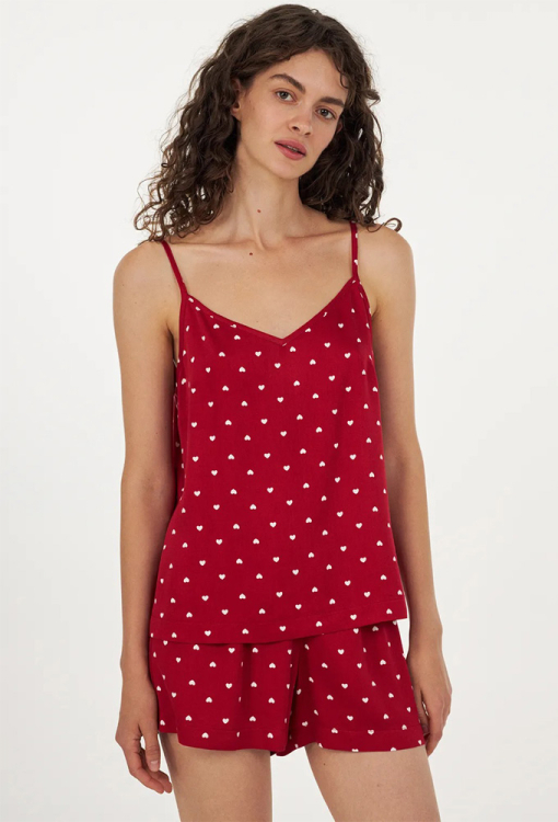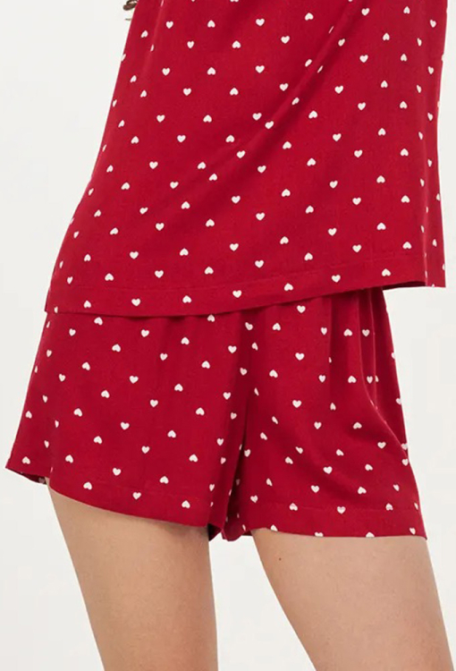 Яскрава жіноча піжама з колекції Rosy Raindrops від українського бренду Ellen. Піжама виконана з якісної та м'якої віскози, червоного кольору в білий принт із дрібних сердець, складається з майки та шорт вільного силуету. Майка з тонкими регульованими бретелями та V-подібним декольте, шорти з м'якою гумкою в поясі. Піжама дуже красива і комфортна, також може бути чудовим одягом для дому або корисним подарунком коханій та близькій людині.