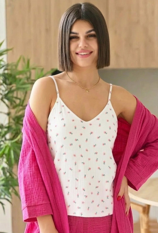 Яскрава жіноча піжама з халатом від українського бренду LoomLine. Комплект виконаний з якісного та м'якого двошарового мусліну, складається з халату із шортами рожевого кольору та білої майки з принтом у вигляді рожевих тюльпанів. Халат з рукавами 3/4 та довжиною вище колін, зав'язується на запах за допомогою пояса. Майка вільного силуету, на тонких бретелях, що регулюються, і з V-подібним вирізом горла, шорти прямі з м'якою гумкою в поясі. Комплект красивий та приємний до тіла, ідеальний як для сну, так і для домашнього затишку, а також може бути чудовим подарунком коханій та близькій людині.