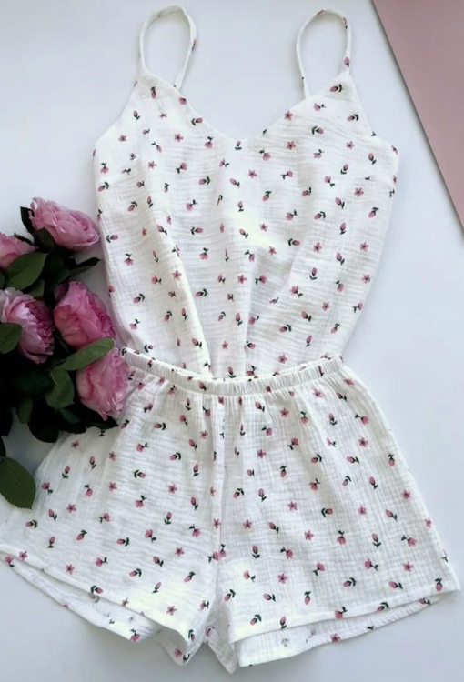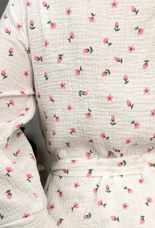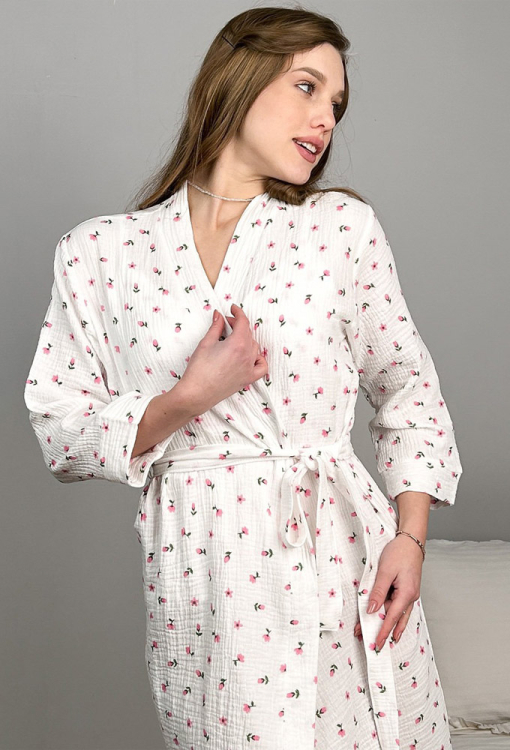 Ніжна жіноча піжама з халатом від українського бренду LoomLine. Комплект виконаний з якісного та м'якого двошарового мусліну, білого кольору з принтом у вигляді дрібних рожевих тюльпанів із зеленим листям, складається з халата, майки та шортів. Халат з рукавами 3/4 та довжиною вище колін, зав'язується на запах за допомогою пояса. Майка вільного силуету, на тонких бретелях, що регулюються, і з V-подібним вирізом горла, шорти прямі з м'якою гумкою в поясі. Комплект красивий та приємний до тіла, ідеальний як для сну, так і для домашнього затишку, а також може бути чудовим подарунком коханій та близькій людині.