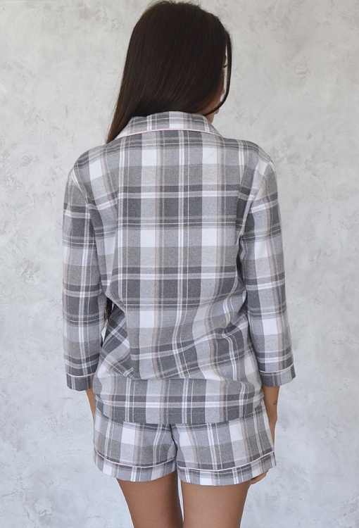 Класична жіноча піжама із колекції Graycell від українського бренду Roksana. Піжама виконана з м'якої та якісної сумішевої бавовни з начосом, сірого кольору в картатий принт, складається з сорочки та шортів. Сорочка вільного крою з рукавами 3/4 і відкладним коміром, застібається на ґудзики, на грудях маленька накладна кишенька. Комір, полиці, рукави та кишеня прикрашені тонким кантом рожевого кольору. Шорти з м'якою гумкою у поясі, внизу оброблені рожевим кантом. Піжама дуже красива і комфортна, ідеальна для сну та домашнього відпочинку, а також може бути корисним подарунком коханій та близькій людині.