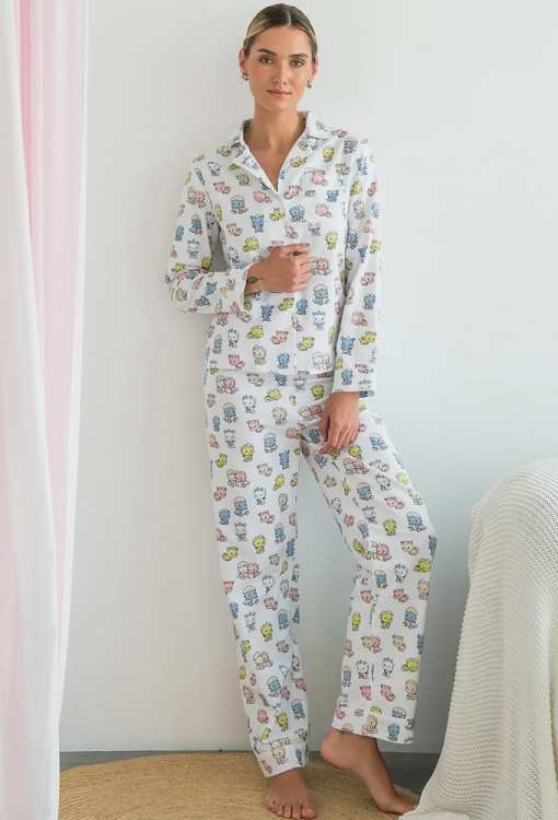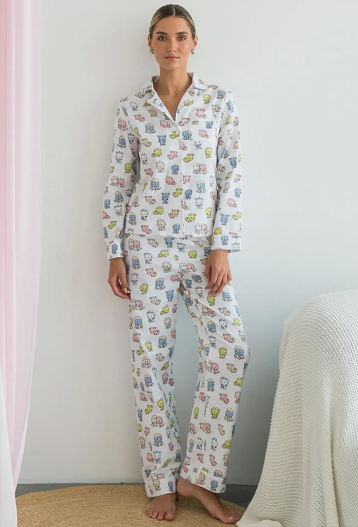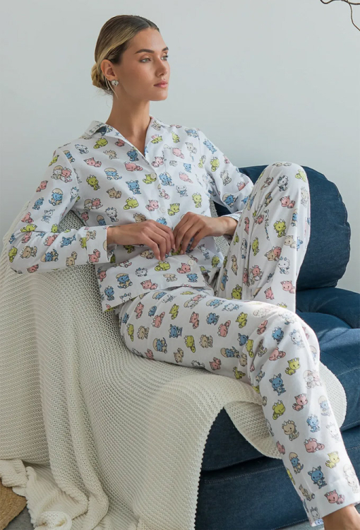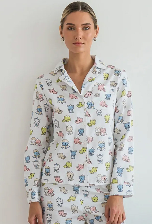 Тепла жіноча піжама Dinoworld від українського бренду Forly. Піжама виконана з якісної та м'якої фланелі білого кольору в принт із різнокольорових динозаврів, складається з сорочки вільного силуету та прямих штанів. Сорочка з довгими рукавами на манжетах і відкладним коміром, застібається на гудзики, на грудях маленька накладна кишенька. Штани з високою посадкою та м'якою гумкою у поясі, внизу оброблені вільними манжетами. Піжама дуже красива, тепла і комфортна, можна використовувати як одяг для дому, а також як подарунок коханій та близькій людині.