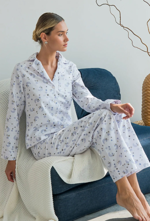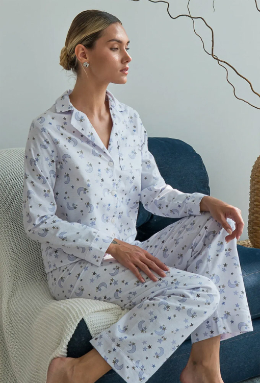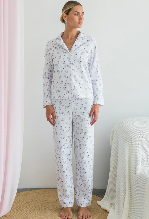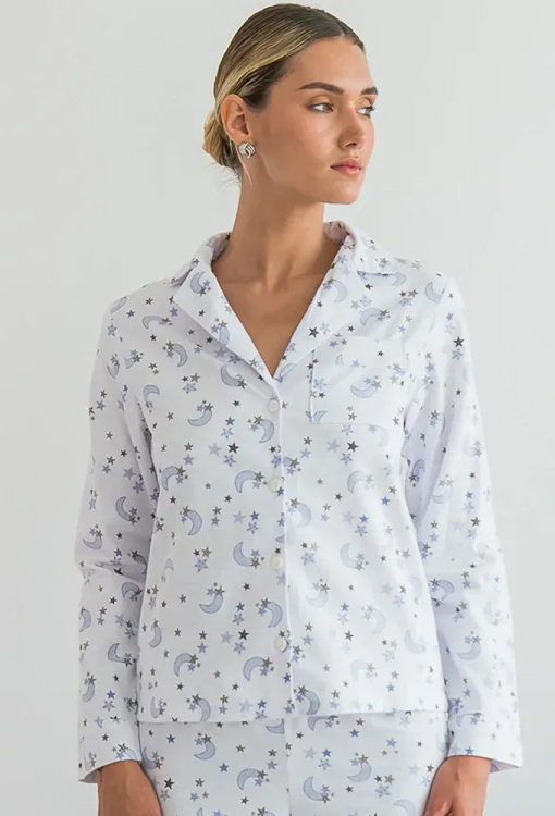 Тепла жіноча піжама Moon у класичному стилі від українського бренду Forly. Піжама виконана з якісної та м'якої фланелі білого кольору в синій зоряний принт, складається з сорочки вільного силуету та прямих штанів. Сорочка з довгими рукавами на манжетах і відкладним коміром, застібається на гудзики, на грудях маленька накладна кишенька. Штани із зручною високою посадкою та м'якою гумкою у поясі, внизу оброблені вільними манжетами. Піжама дуже красива, тепла і комфортна, можна використовувати як одяг для дому, а також як подарунок коханій та близькій людині.