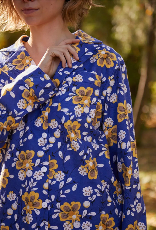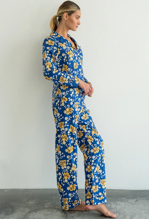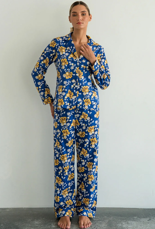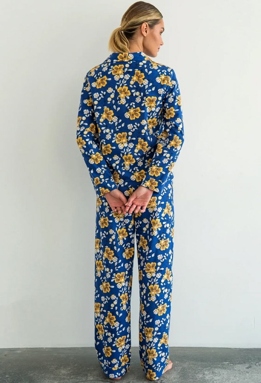 Тепла жіноча піжама Romano від українського бренду Forly. Піжама виконана з якісної та м'якої фланелі темно-синього у жовтий цітковий принт, складається з сорочки вільного силуету та прямих штанів. Сорочка з довгими рукавами на манжетах і відкладним коміром, застібається на гудзики, на грудях маленька накладна кишенька. Штани прямі з високою посадкою, м'якою гумкою в поясі та манжетами. Піжама дуже красива, тепла і комфортна, можна використовувати як одяг для дому, а також як подарунок коханій та близькій людині.