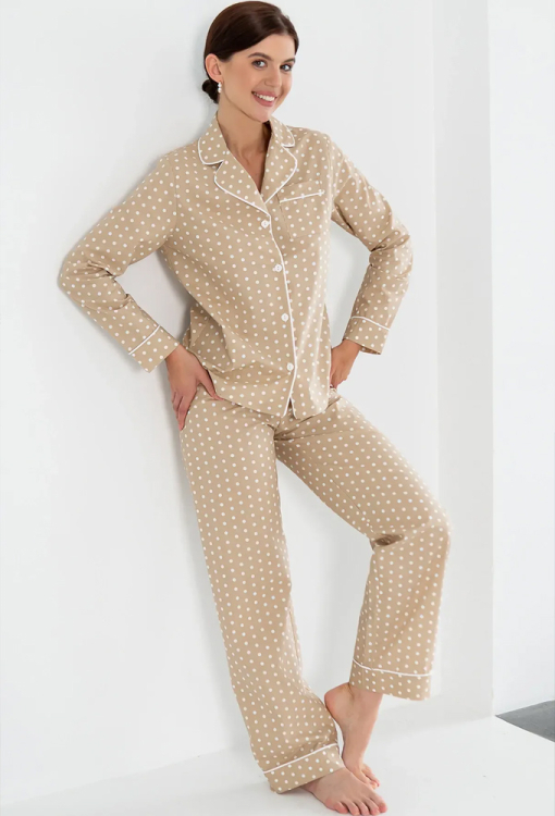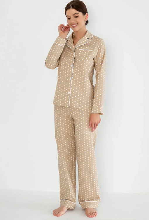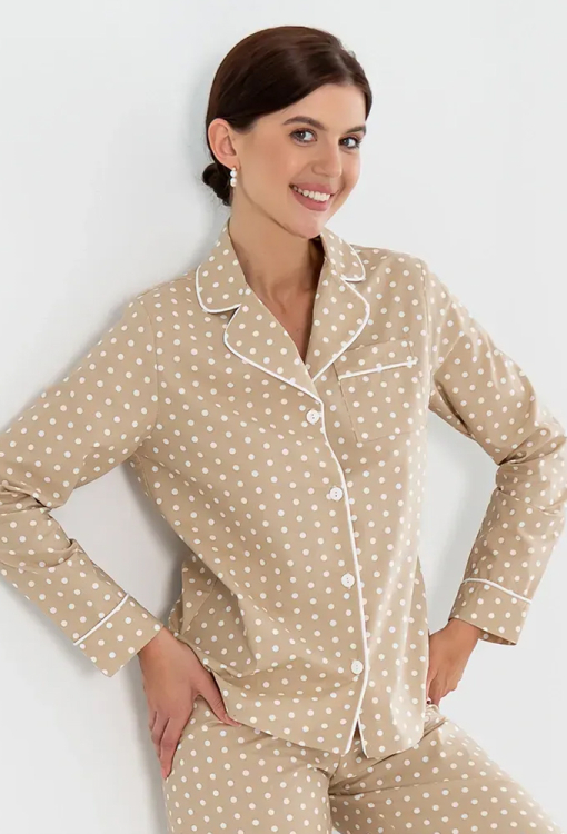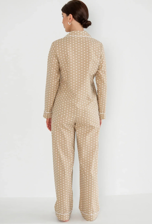 Жіноча бавовняна піжама Creamy Flakes від українського бренду Forly. Піжама виконана з якісної та м'якої бавовни бежевого кольору в білий гороховий принт, складається з сорочки вільного силуету та прямих штанів. Сорочка з довгими рукавами і відкладним коміром, застібається на гудзики, на грудях зліва маленька накладна кишенька, штани з високою посадкою та м'якою гумкою в поясі. Комір, полиці, кишеню та рукави сорочки, а також штани внизу прикрашені тонким кантом білого кольору. Піжама дуже красива і комфортна, можна використовувати як одяг для дому, а також як подарунок коханій та близькій людині.
