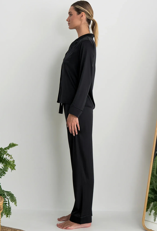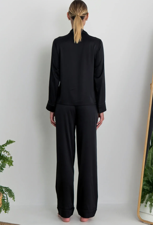 Класичний піжамний костюм "Total Black" від українського бренду Forly. Костюм виконаний з якісного та м'якого штучного шовку чорного кольору, складається з сорочки та штанів. Сорочка вільного крою, з довгими рукавами на манжетах і відкладним коміром, застібається на гудзики, вгорі зліва накладна кишенька. Штани прямі, з високою посадкою, м'якою гумкою в поясі, внутрішньою зав'язкою та манжетами внизу. Комір, полиці, кишеня та манжети костюма прикрашені тонким кантом чорного кольору. Костюм дуже красивий, повітряний і приємний до тіла, можна використовувати для сну, будинку та вуличних прогулянок, а також як подарунок коханій та близькій людині.