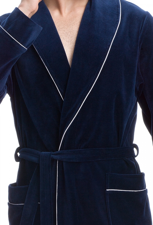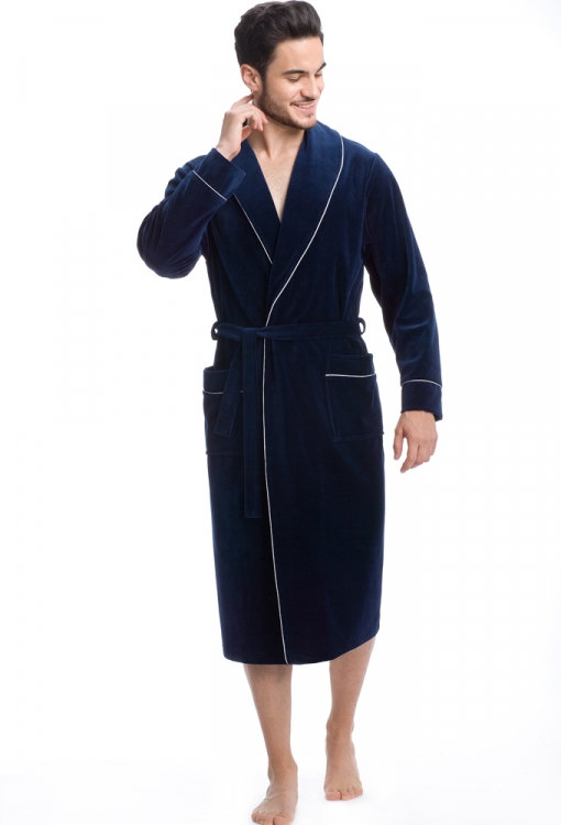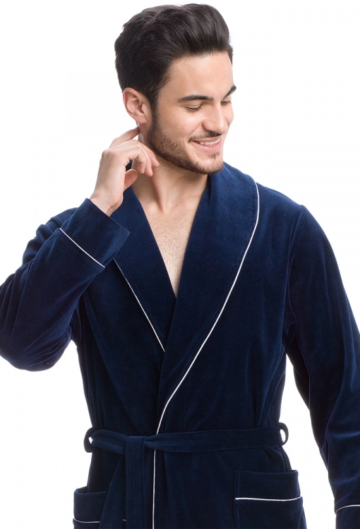 Класичний чоловічий халат від польського бренду Dorota. Халат виконаний з високоякісного та м'якого велюру темно-синього кольору, з довгими рукавами та шалевим коміром, зав'язується на запах за допомогою пояса. Довжина моделі трохи нижче колін, з боків дві глибокі накладні кишені, борта, кишені та рукава прикрашені кантом білого кольору. Халат теплий та комфортний, буде чудовим подарунком для коханої людини.