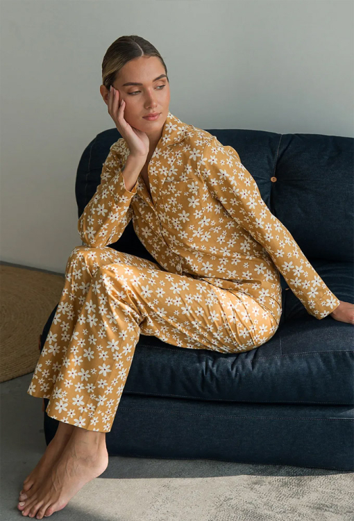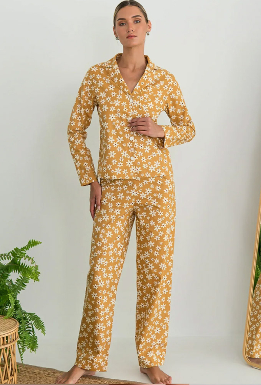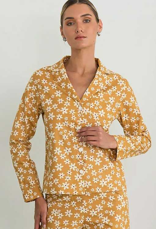 Жіноча піжама Jenet від українського бренду Forly. Піжама виконана з якісної та м'якої бавовни темно-жовтого кольору в принт білих кольорів, складається з сорочки та штанів. Сорочка вільного крою, з довгими рукавами на манжетах і відкладним коміром, застібається на гудзики, вгорі зліва накладна кишенька. Штани прямі, з високою посадкою та м'якою гумкою у поясі, внизу на манжетах. Піжама дуже красива, приємна до тіла, також можна використовувати як одяг для дому або як подарунок коханій та близькій людині.