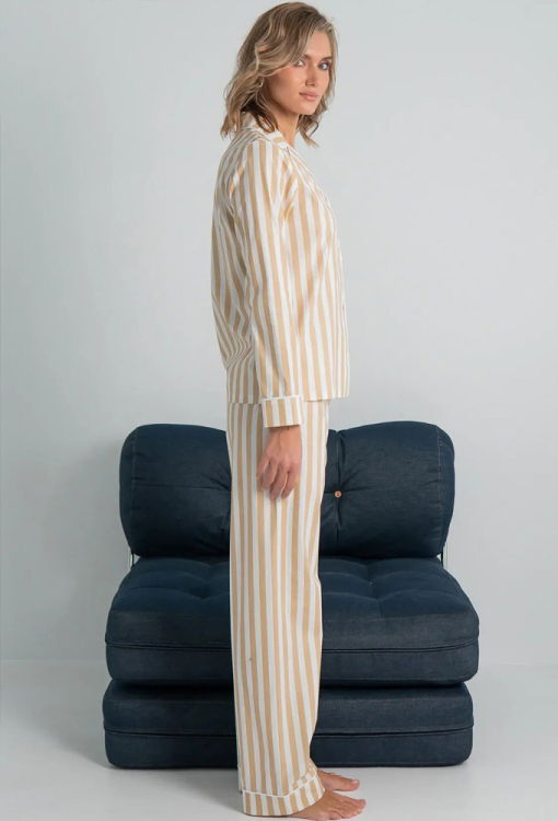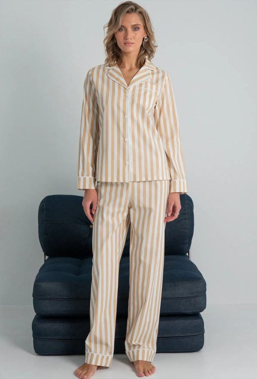 Класична жіноча піжама Lines від українського бренду Forly. Піжама виконана з якісної та м'якої бавовни в смугастий принт бежевого та білого кольору, складається з сорочки та штанів. Сорочка вільного крою, з довгими рукавами на манжетах і відкладним коміром, застібається на гудзики, вгорі зліва накладна кишенька. Штани прямі, з високою посадкою та м'якою гумкою у поясі, внизу на манжетах. Комір, полиці, манжети та кишеня прикрашені тонким кантом білого кольору. Піжама дуже красива, комфортна і приємна до тіла, можна використовувати як одяг для дому, а також як подарунок коханій та близькій людині.