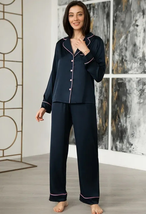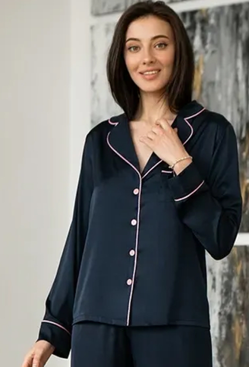 Шикарний пижамний костюм Blue Dark від українського бренду Forly. Костюм виконаний з якісного та м'якого штучного шовку темно-синього кольору, складається з сорочки та штанів. Сорочка вільного крою, з довгими рукавами на манжетах і відкладним коміром, застібається на гудзики, вгорі зліва накладна кишенька. Штани прямі, з високою посадкою, м'якою гумкою в поясі, внутрішньою атласною зав'язкою рожевого кольору та манжетами внизу. Комір, полиці, кишеня та манжети костюма прикрашені тонким кантом рожевого кольору. Костюм дуже красивий, повітряний і приємний до тіла, можна використовувати для сну, будинку та вуличних прогулянок, а також як подарунок коханій та близькій людині.