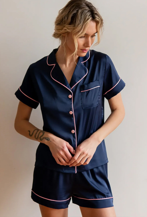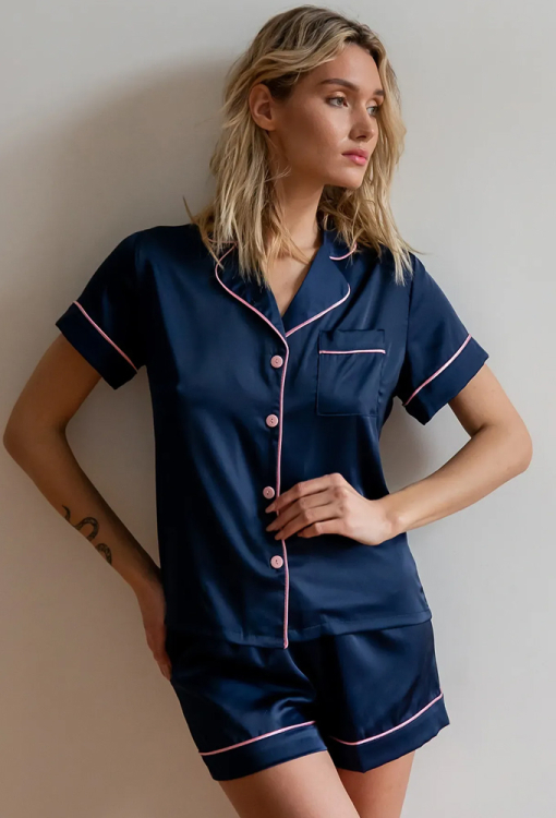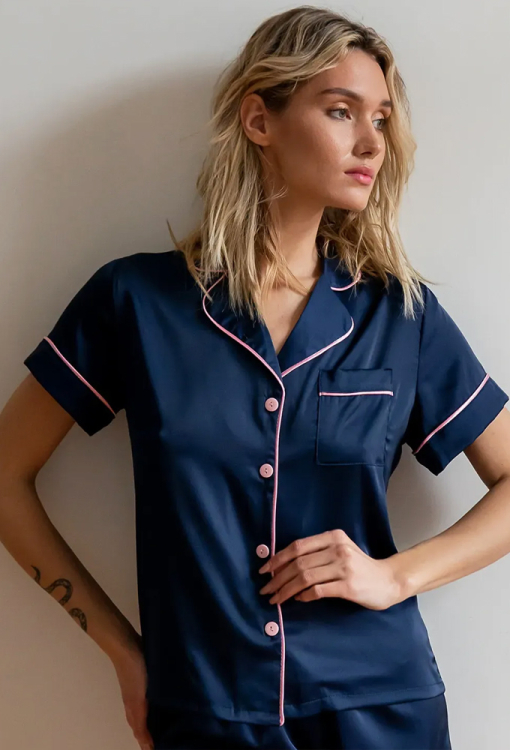 Класична жіноча піжама Indigo від українського бренду Forly. Піжама виконана з якісного та м'якого штучного шовку темно-синього кольору, складається з сорочки вільного силуету та коротких шортів. Сорочка з короткими рукавами на манжетах і відкладним коміром, застібається на гудзики, на грудях маленька накладна кишенька. Шорти з високою талією, м'якою гумкою в поясі та зав'язкою, внизу оброблені манжетами. Комір, полиці, кишеню та рукави сорочки, а також шорти внизу прикрашені тонким кантом рожевого кольору. За рахунок високої якості тканини, виріб не дає усадку, практичний та легкий у догляді, а завдяки м'яким закритим швам, виглядає акуратно і забезпечує ніжний дотик до тіла. Піжама дуже красива і комфортна, можна використовувати як одяг для дому, а також як подарунок коханій та близькій людині.