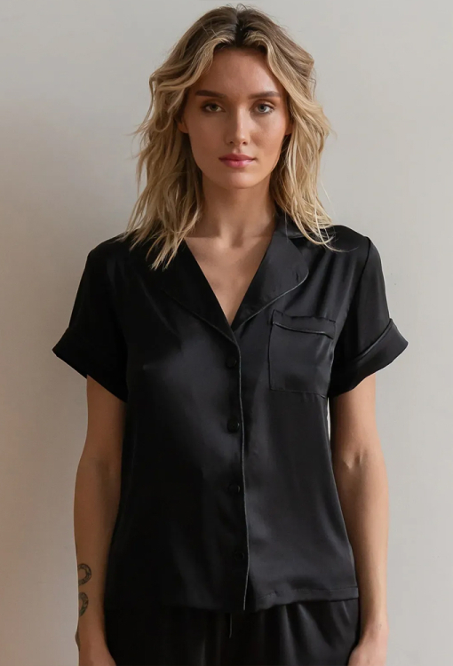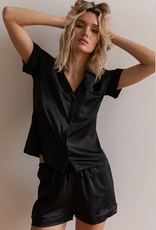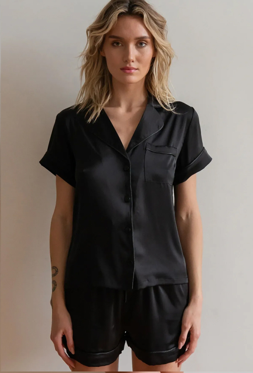Класична жіноча шовкова піжама Onyx від українського бренду Forly. Піжама виконана з якісного та м'якого штучного шовку чорного кольору, складається з сорочки вільного силуету та коротких шортів. Сорочка з короткими рукавами на манжетах і відкладним коміром, застібається на гудзики, на грудях маленька накладна кишенька. Шорти з високою талією, м'якою гумкою в поясі та зав'язкою, внизу оброблені манжетами. Комір, полиці, кишеню та рукави сорочки, а також шорти внизу прикрашені тонким кантом чорного кольору. За рахунок високої якості тканини, виріб не дає усадку, практичний та легкий у догляді, а завдяки м'яким закритим швам, виглядає акуратно і забезпечує ніжний дотик до тіла. Піжама дуже красива і комфортна, можна використовувати як одяг для дому, а також як подарунок коханій та близькій людині.