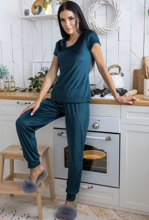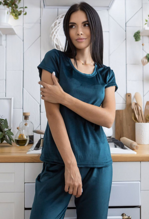 Комфортна жіноча піжама від українського бренду MiaNaGreen. Піжама виконана з м'якого та якісного велюру, темно-зеленого кольору, складається з футболки та штанів. Футболка вільного силуету, з короткими рукавами та круглим вирізом горла, штани з м'якою гумкою у поясі, внизу оброблені манжетами. Піжама дуже красива і приємна до тіла, ідеальна для сну в холодну пору, також може бути хорошим варіантом подарунка коханій або близькій людині!